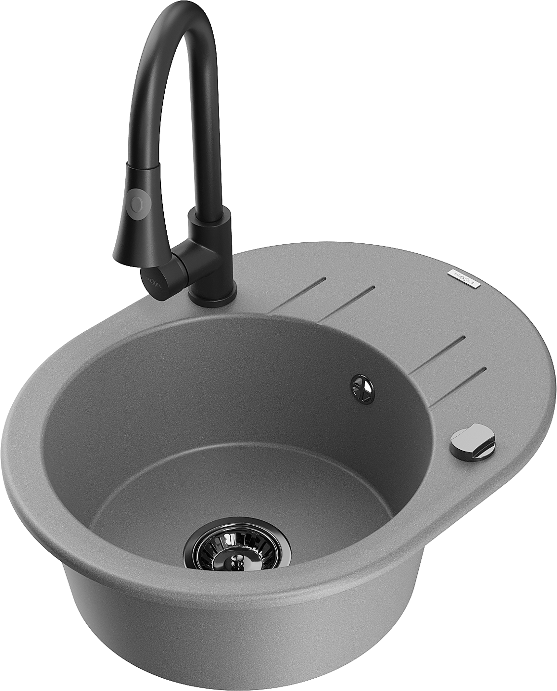 Mexen Kevin chiuvetă de granit cu 1 compartiment cu scurgător și baterie de bucătărie Elia, gri - 6517-71-670101-70-B