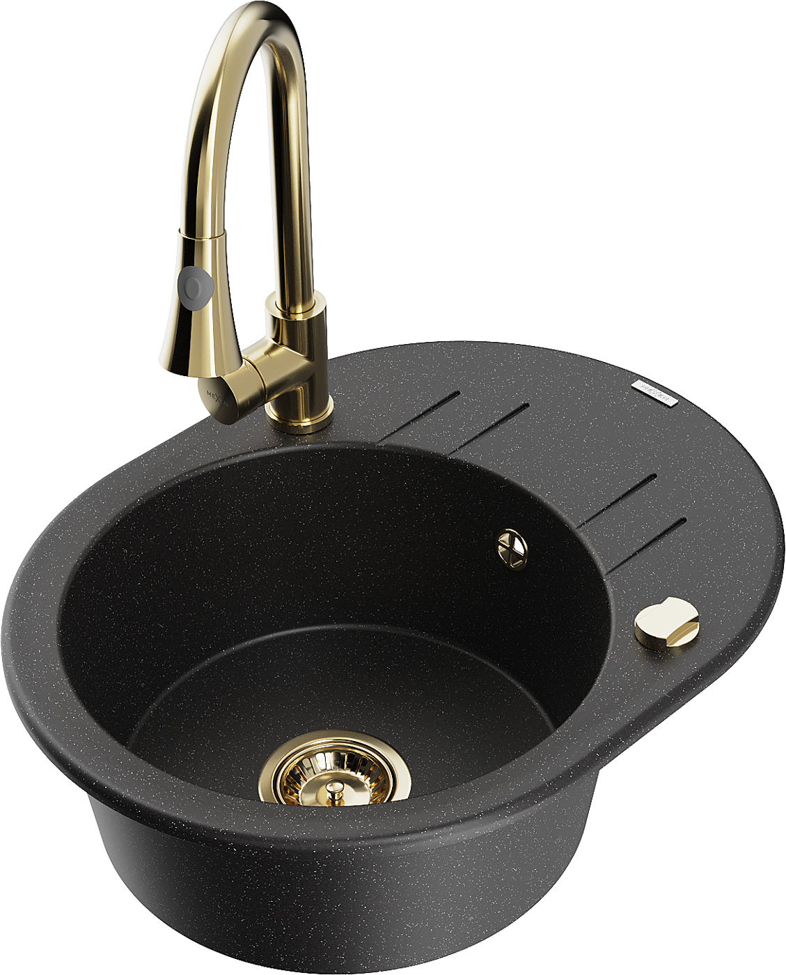 Mexen Kevin chiuvetă de granit cu o singură cameră cu picurător și baterie de bucătărie Elia, negru/argintiu metalizat