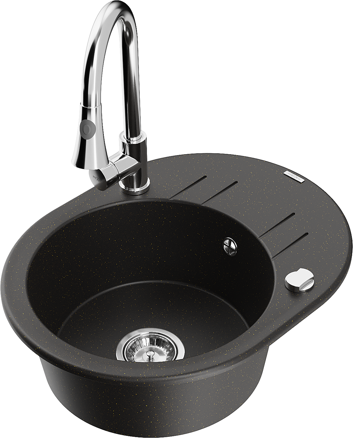 Mexen Kevin chiuvetă de bucătărie din granit cu o singură cuvă, cu picurător și baterie de bucătărie Elia, negru/auriu