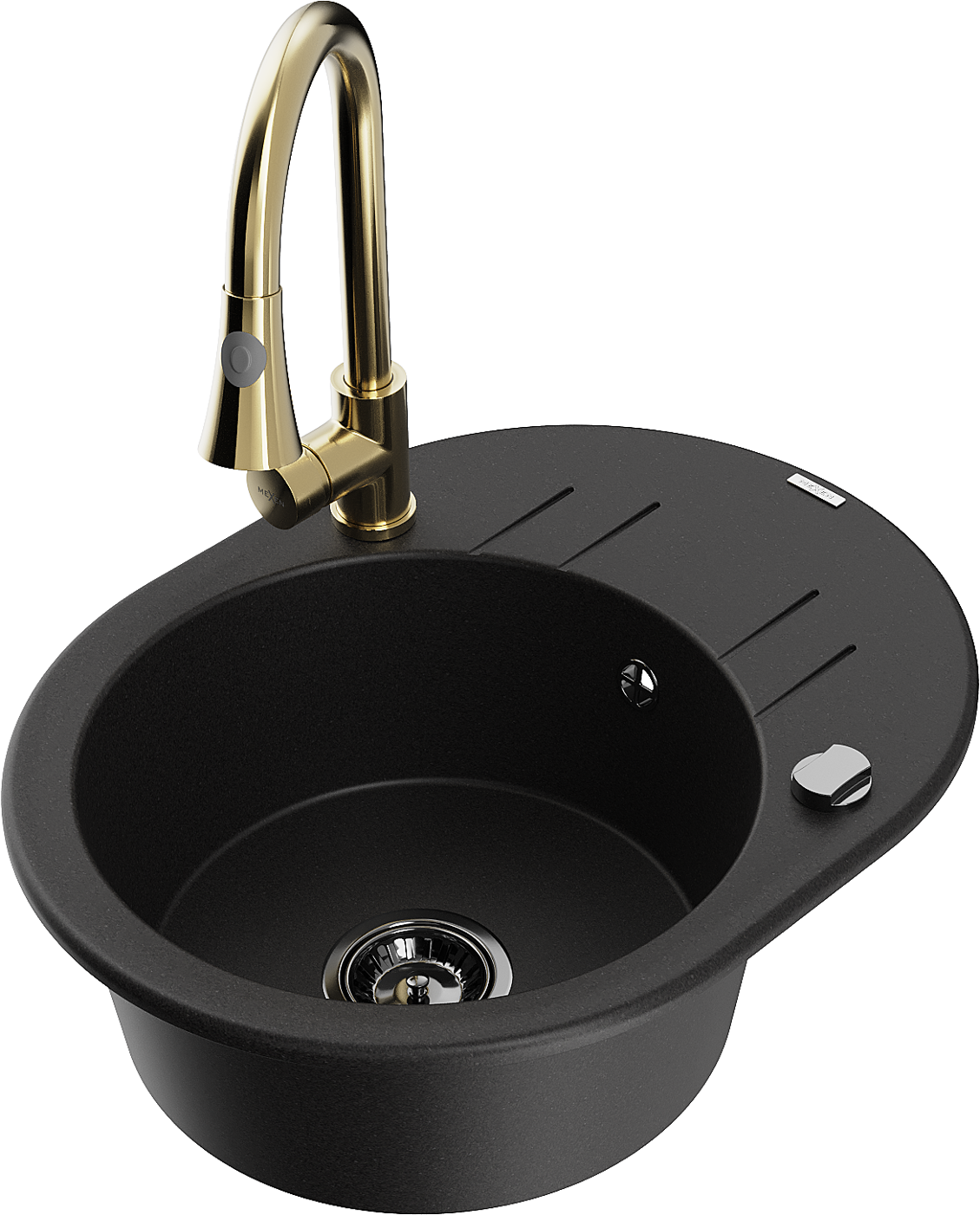 Mexen Kevin chiuvetă de granit cu 1 compartiment, cu picurător și baterie de bucătărie Elia, negru - 6517-77-670101-50-B