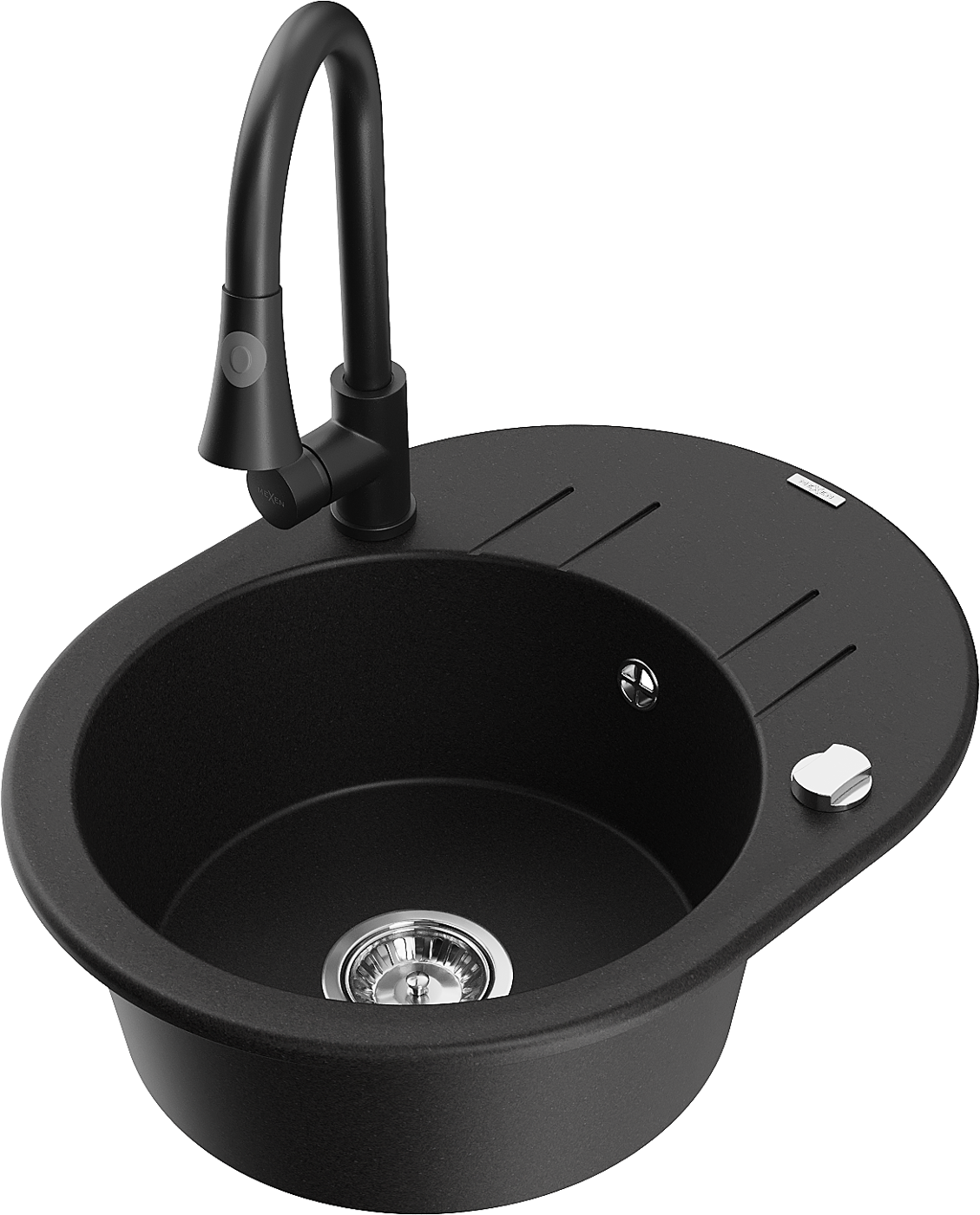 Mexen Kevin chiuvetă din granit cu 1 compartiment, cu scurgător și baterie de bucătărie Elia, neagră - 6517-77-670101-70