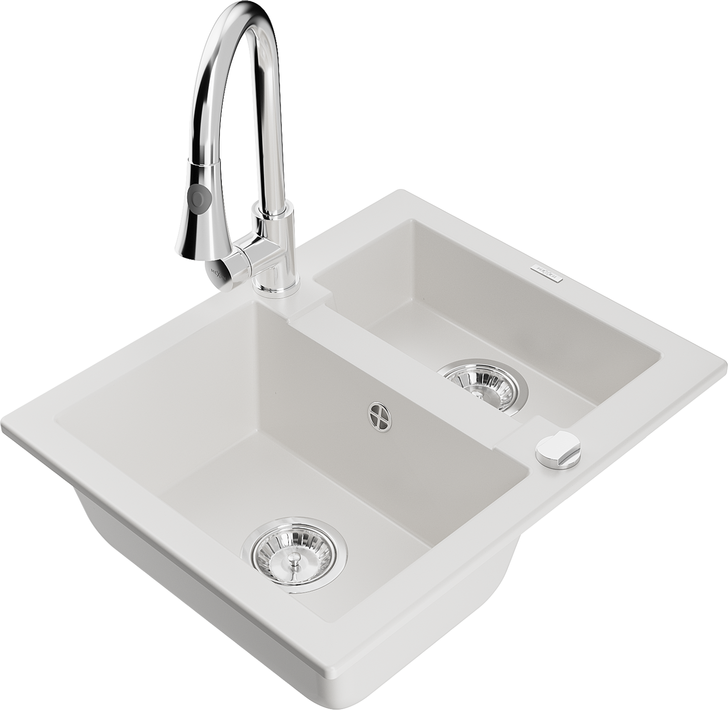 Mexen Carlos chiuvetă din granit cu 1,5 compartimente cu baterie de bucătărie Elia, alb - 6518-20-670101-00