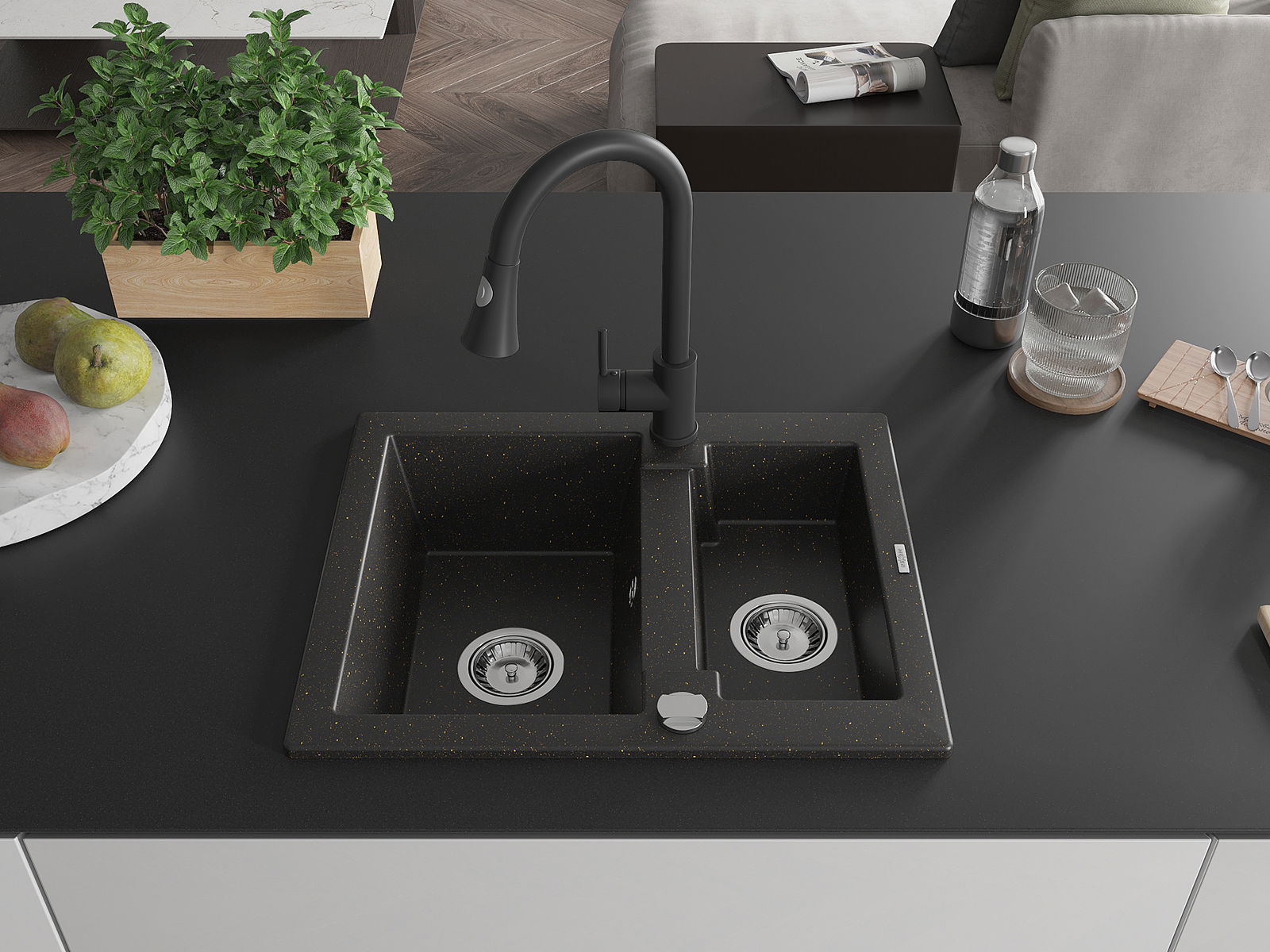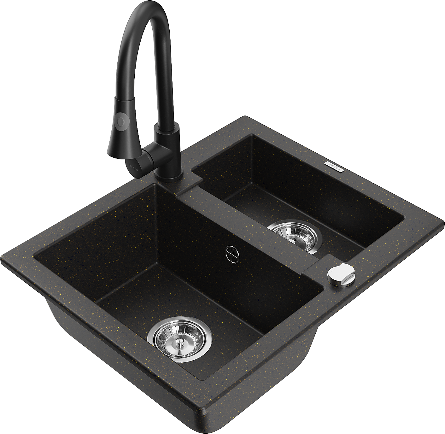 Mexen Carlos chiuvetă de granit 1,5 camere cu baterie de bucătărie Elia, negru/auriu metalic - 6518-75-670101-70