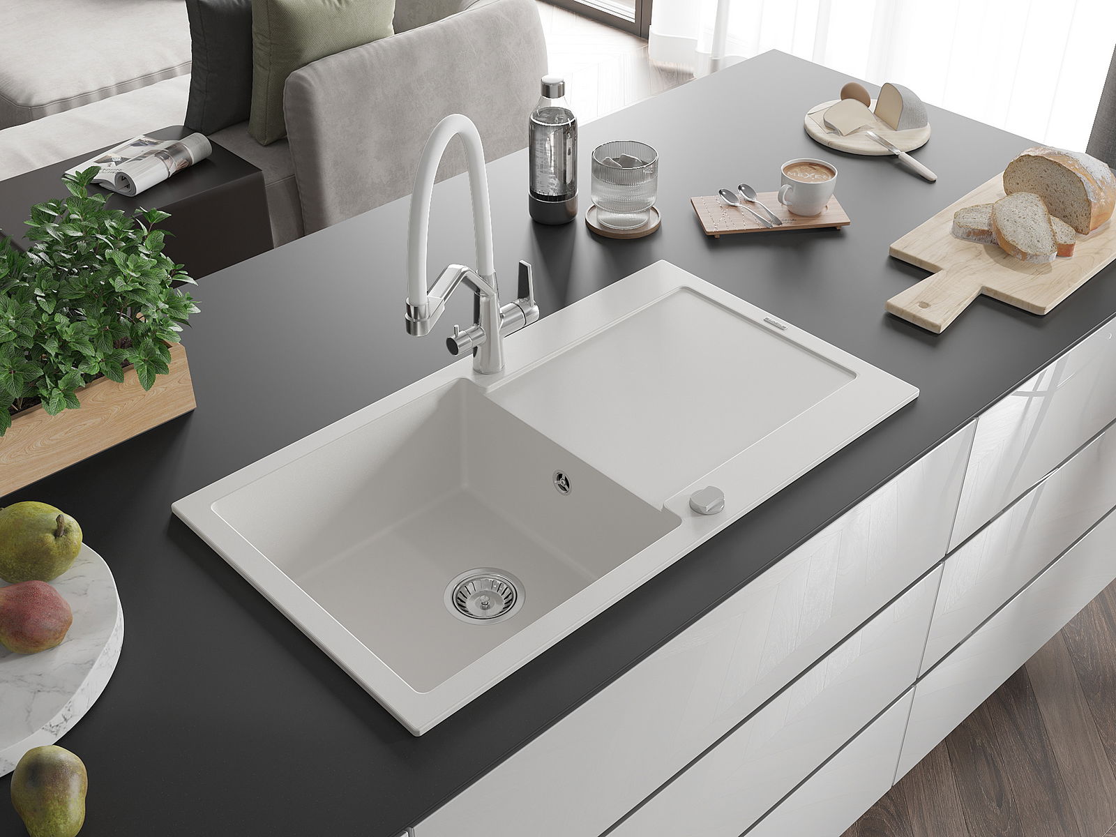 Suprafața chiuvetei este rezistentă la pete și decolorarea, datorită căreia este ușor de curățat și își păstrează culoarea mult timp. Estetică și practic completarea fiecărei bucătării.