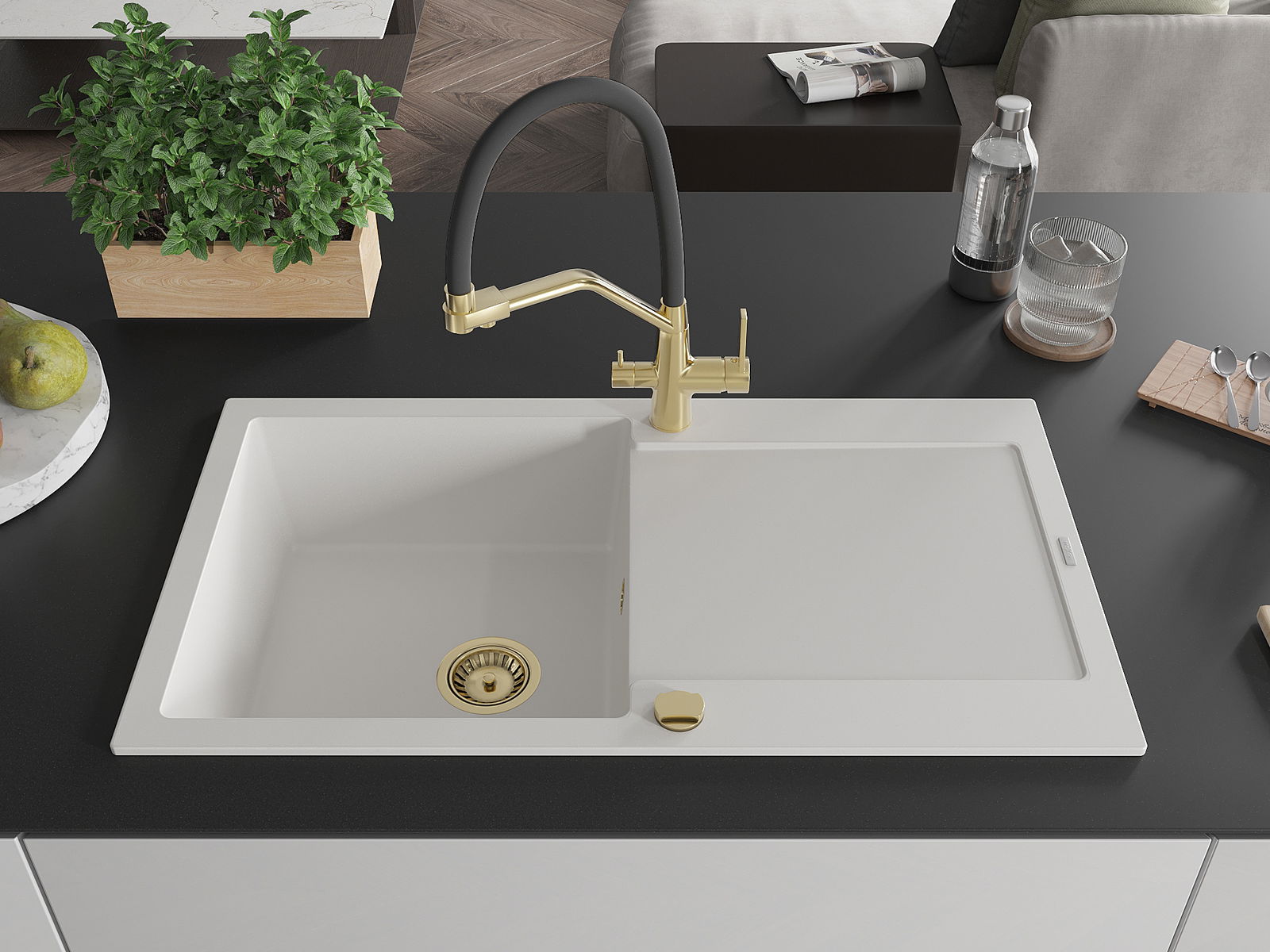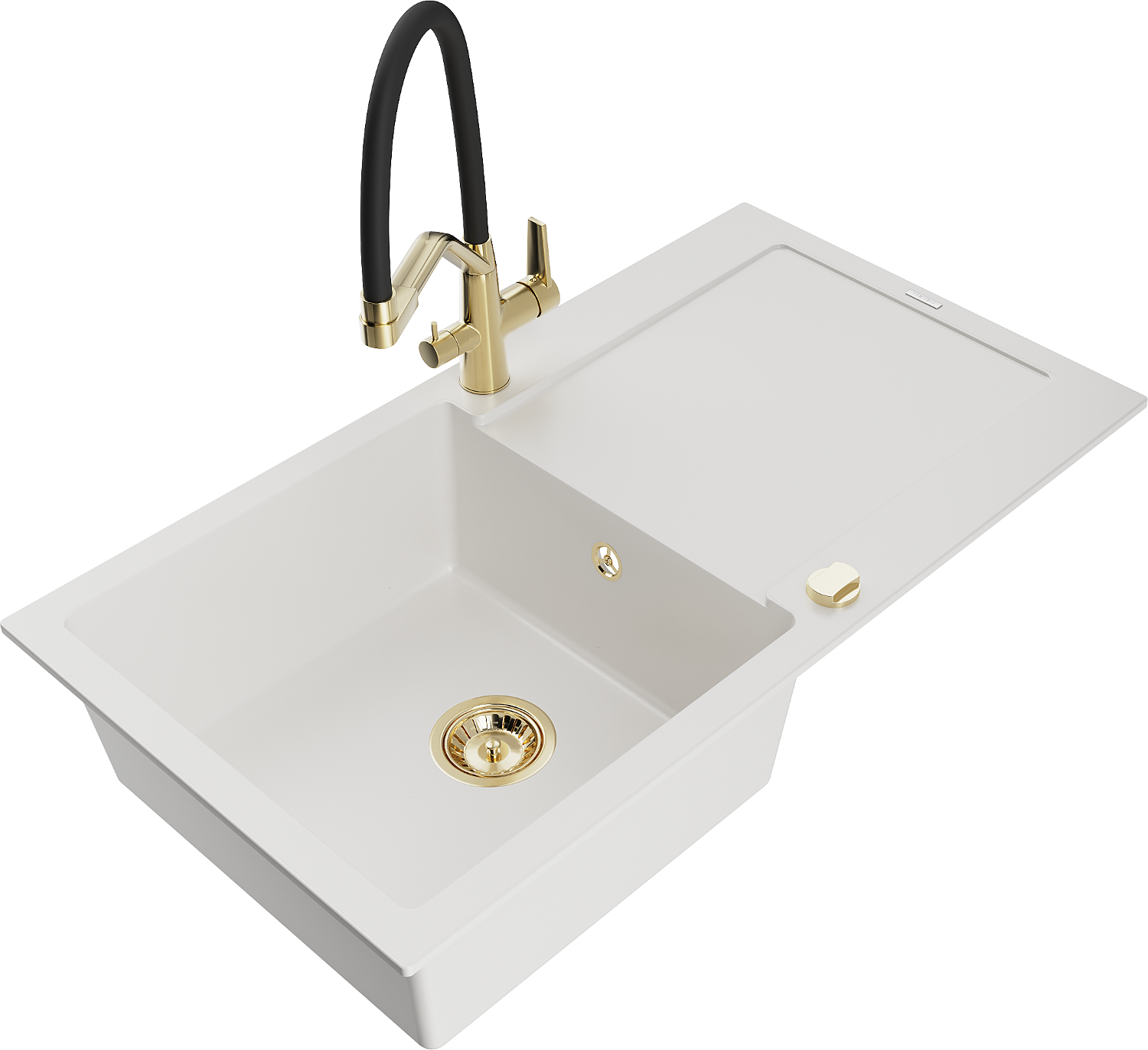 Mexen Leo chiuvetă de granit cu o cuvă și picurător și baterie de bucătărie Duo, alb - 6501-20-671701-57-G