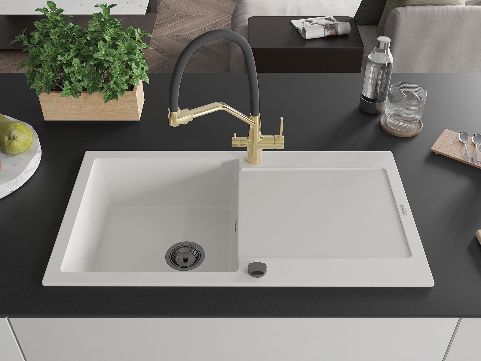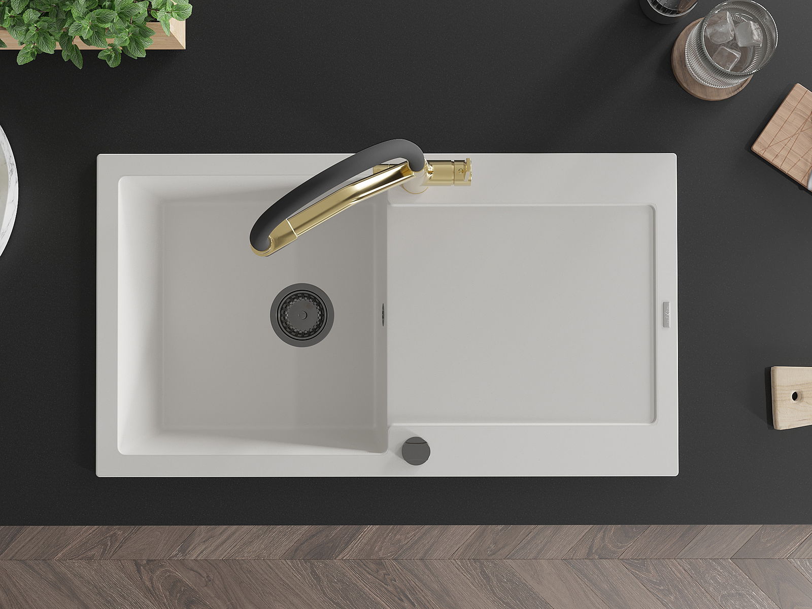 Mexen Leo chiuvetă de granit cu o singură cuvă, cu scurgător și baterie de bucătărie Duo, alb - 6501-20-671701-57-B