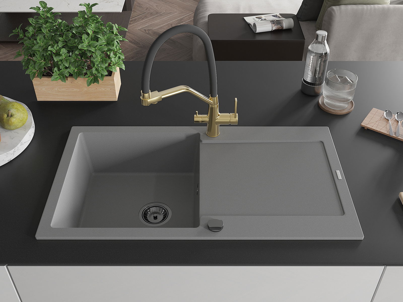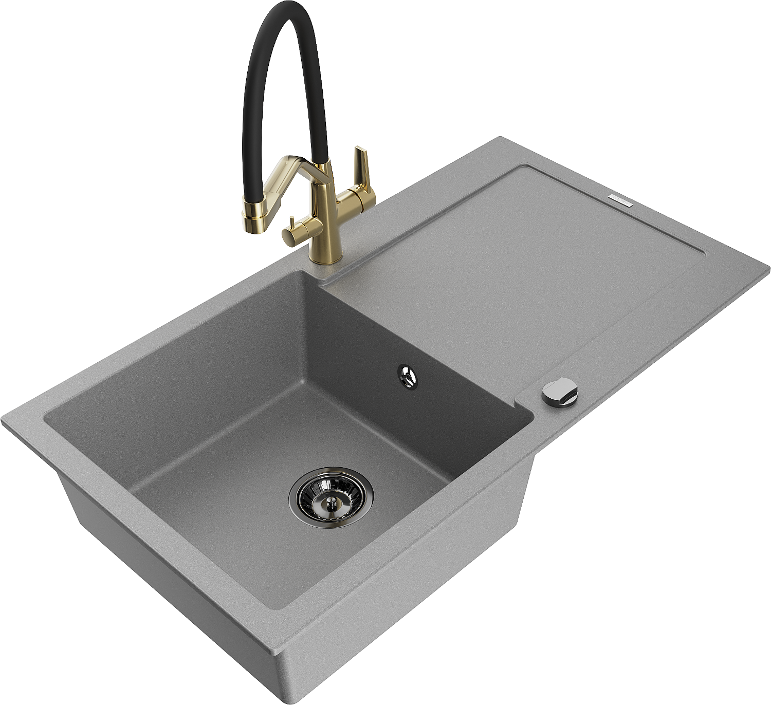 Mexen Leo chiuvetă de granit cu 1 compartiment, cu scurgător și baterie de bucătărie Duo, gri - 6501-71-671701-57-B
