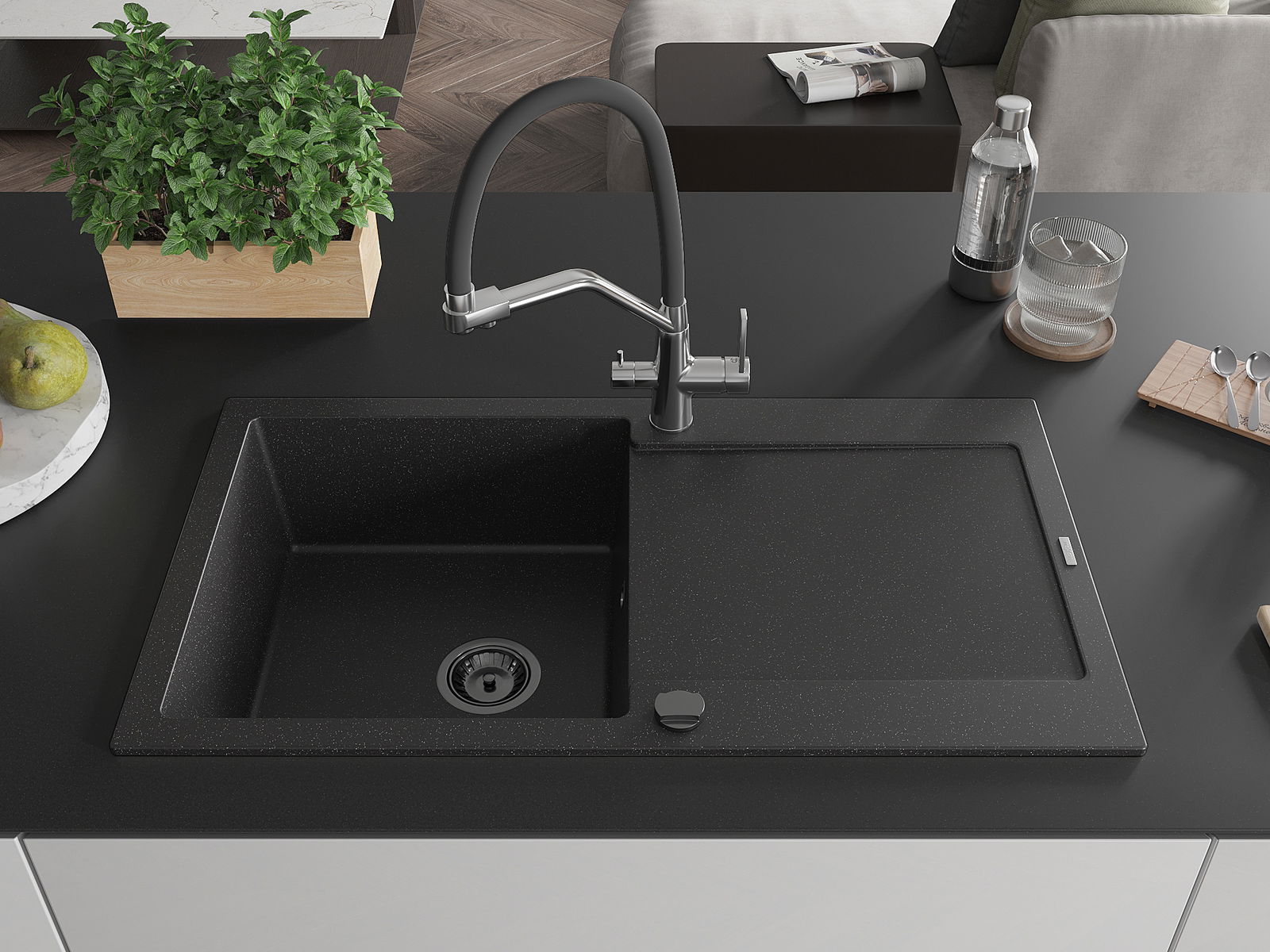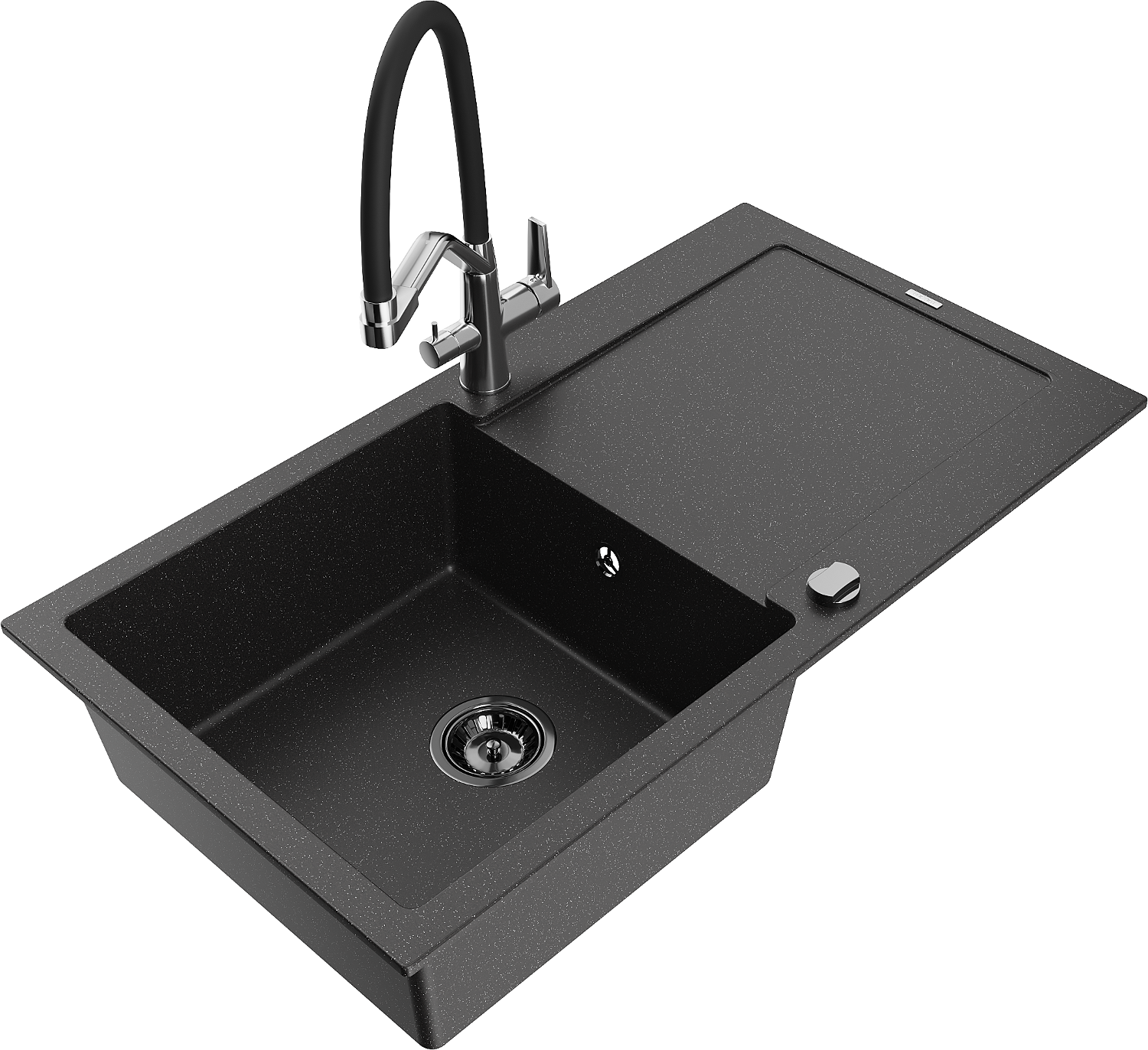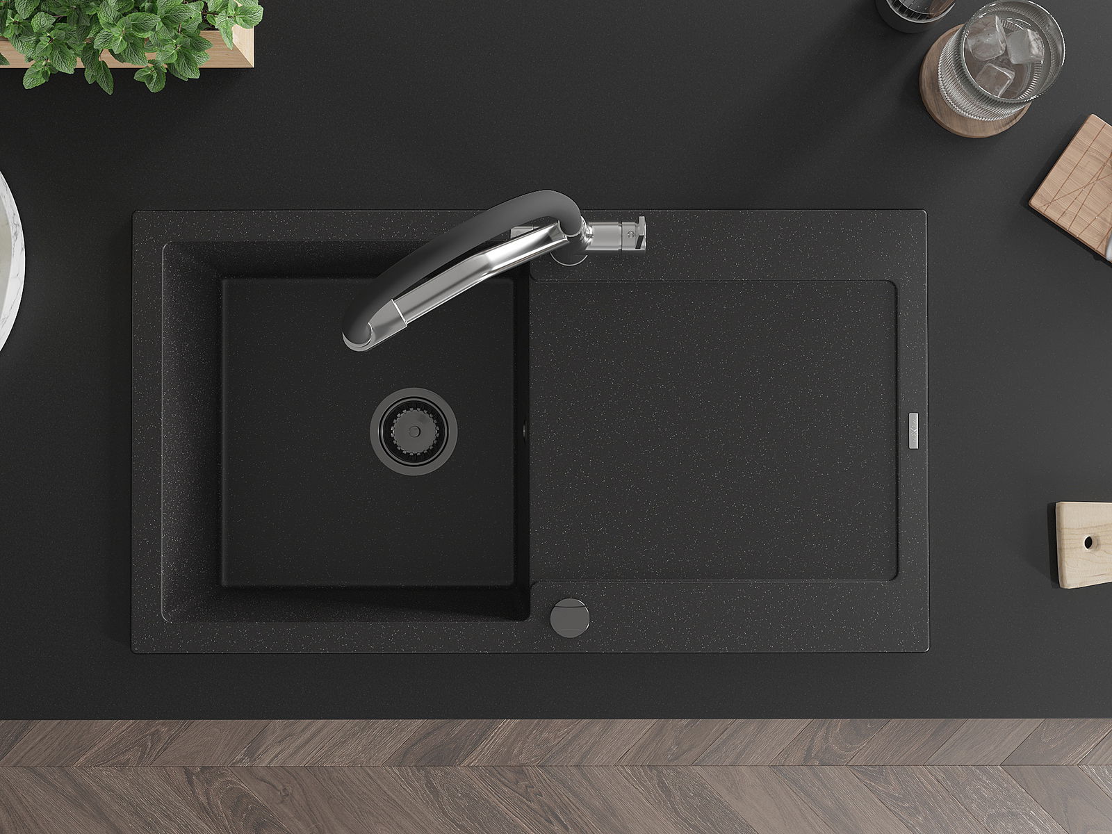 Mexen Leo chiuvetă de bucătărie din granit cu 1 compartiment, cu scurgător și baterie Duo, negru/argintiu metalizat