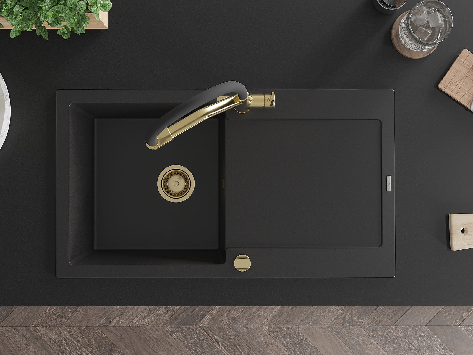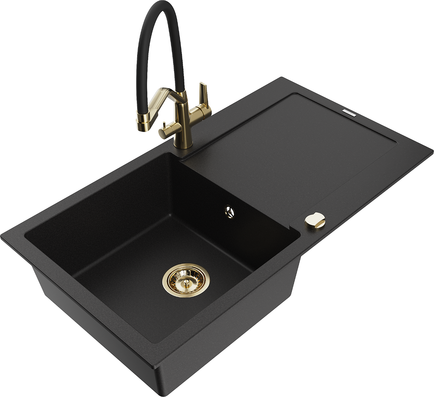 Mexen Leo chiuvetă din granit cu 1 compartiment cu scurgător și baterie de bucătărie Duo, negru - 6501-77-671701-57-G