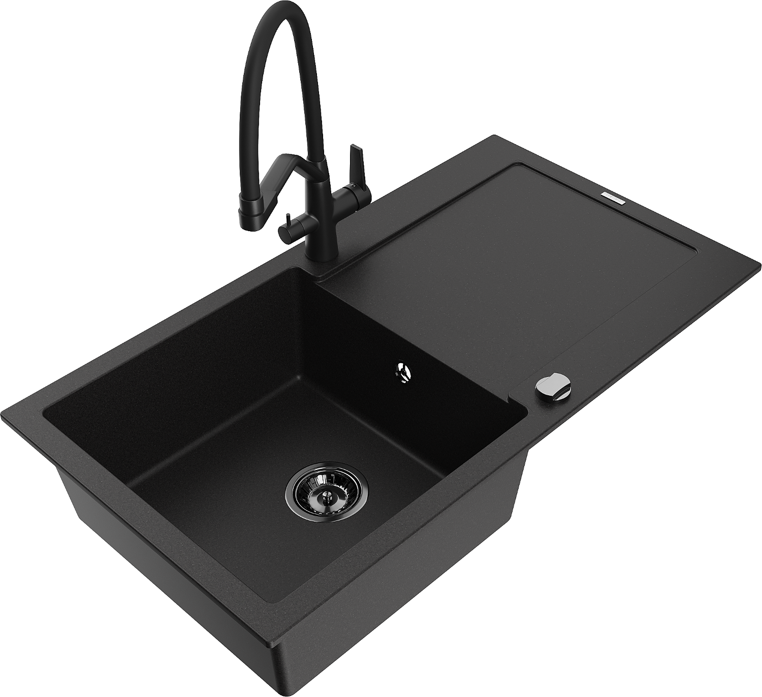 Chiuvetă de bucătărie granitică Mexen Leo cu 1 compartiment și picurător și baterie Duo, negru - 6501-77-671701-70-B
