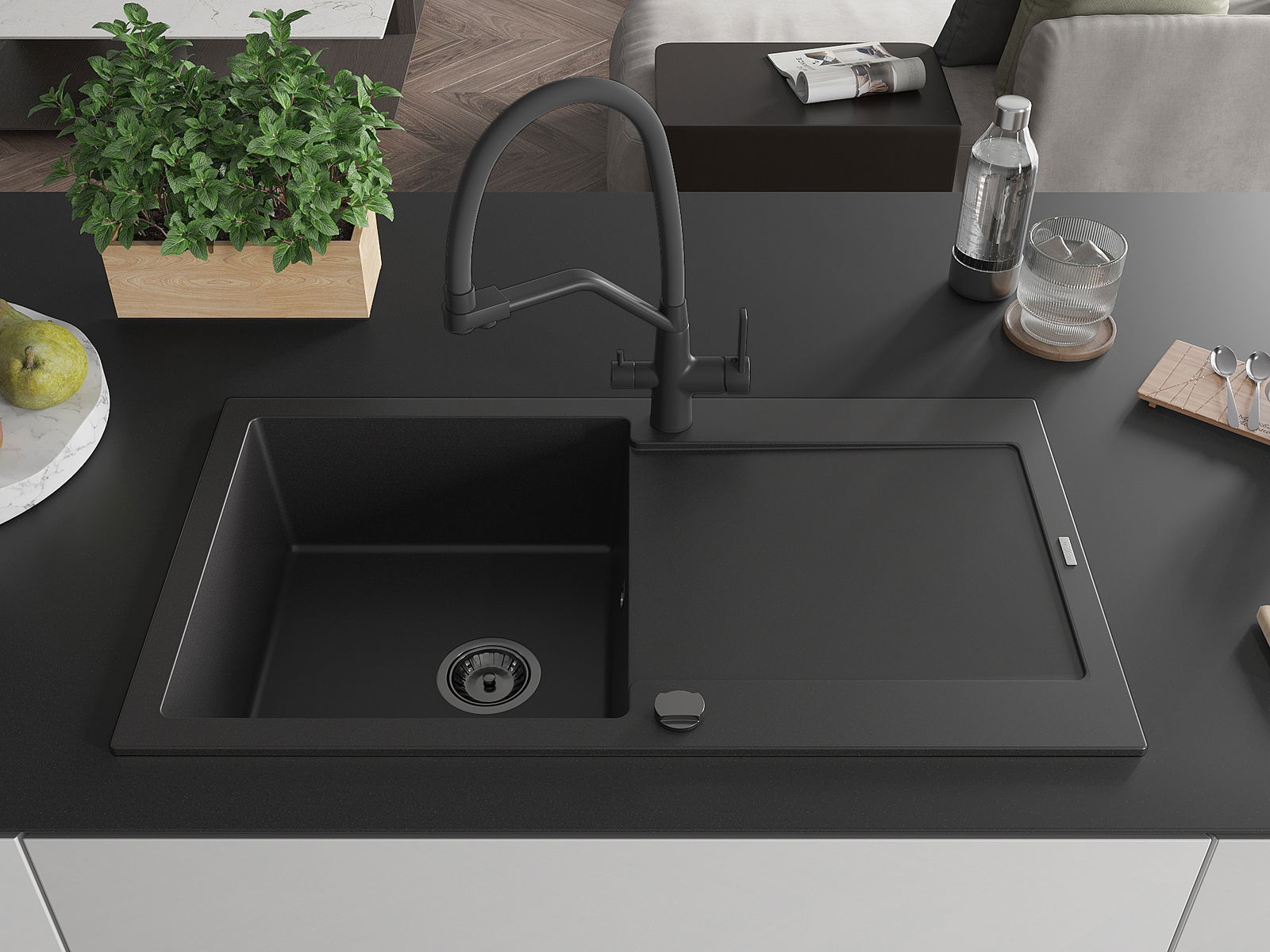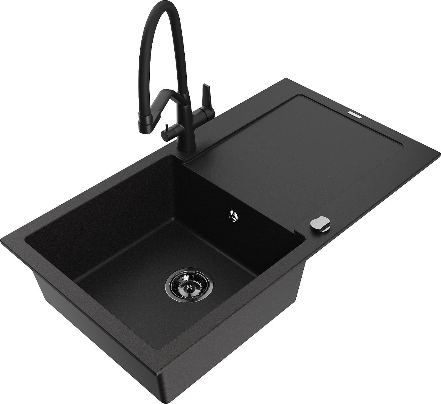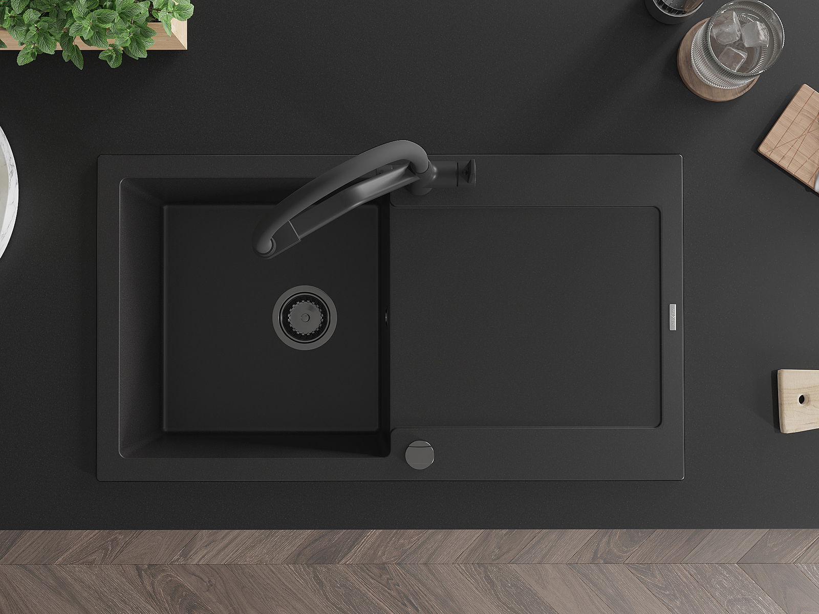 Mexen Leo chiuvetă din granit cu o cuvă, cu scurgător și baterie de bucătărie Duo, negru - 6501-77-671701-70-B