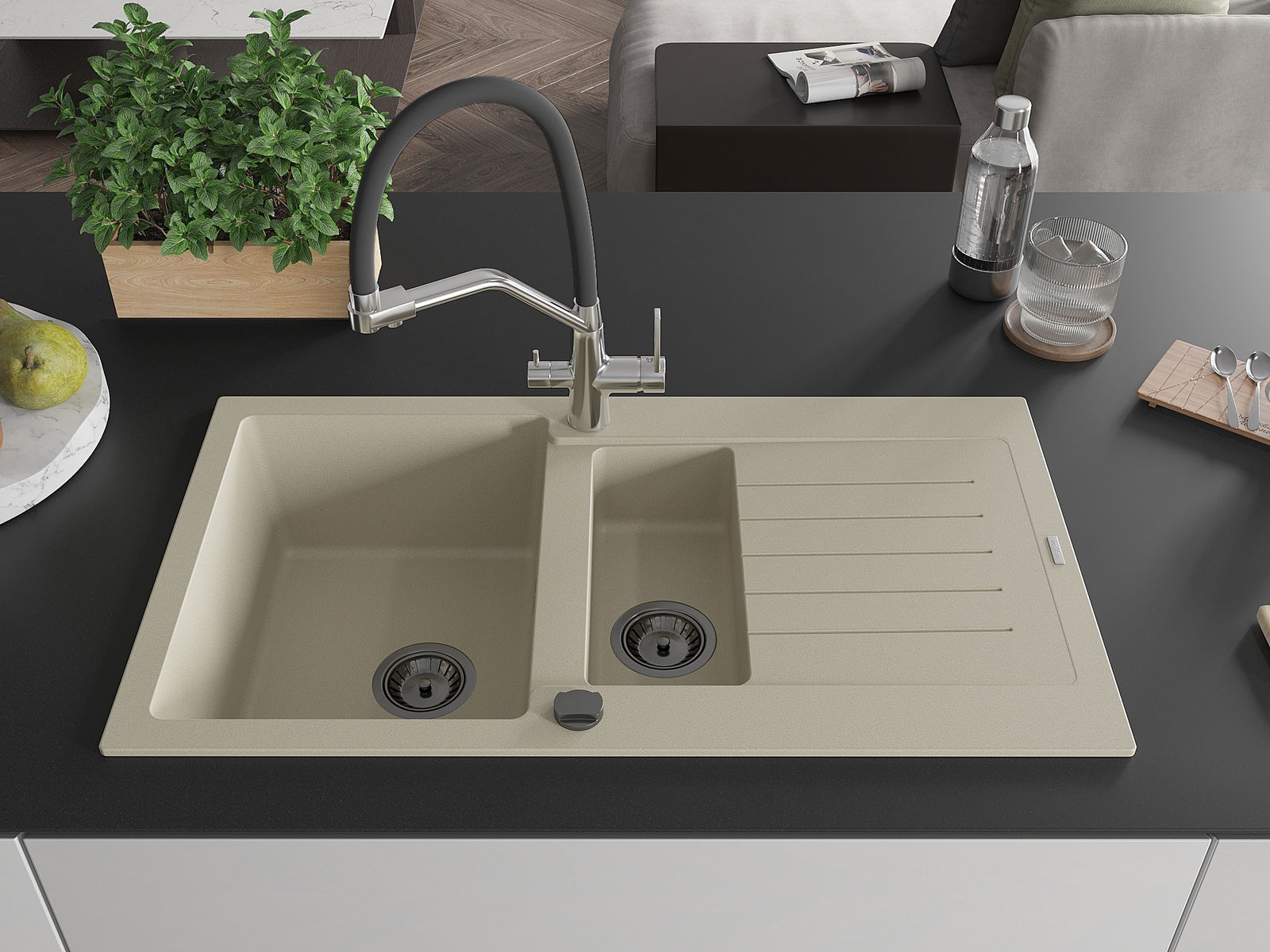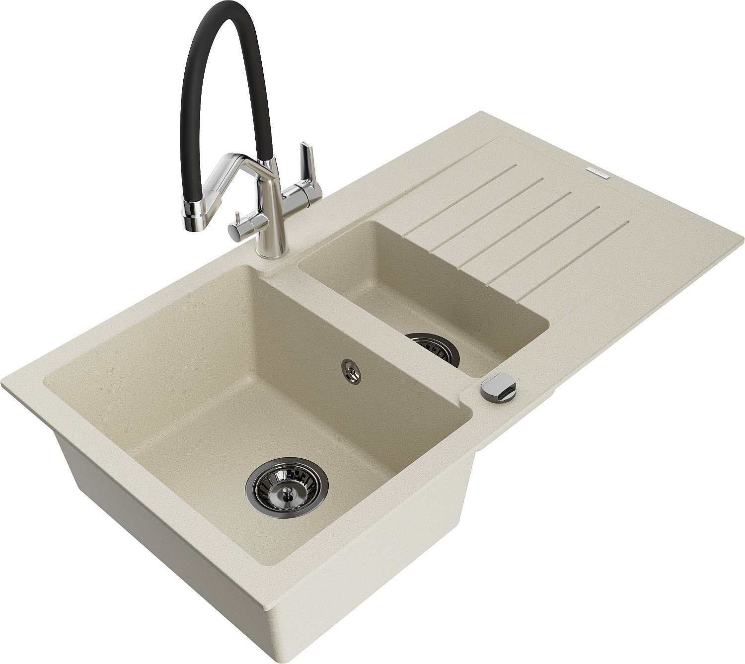 Mexen Matias chiuvetă de granit cu 1,5 compartimente, cu scurgător și baterie de bucătărie Duo, bej - 6502-69-671701-07-B