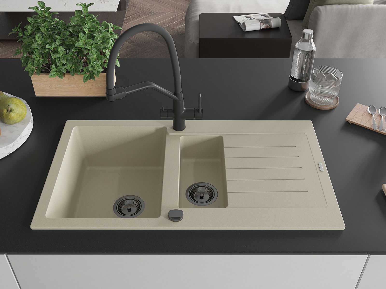 Mexen Matias chiuvetă de granit 1,5 cuve cu scurgător și baterie de bucătărie Duo, bej - 6502-69-671701-70-B