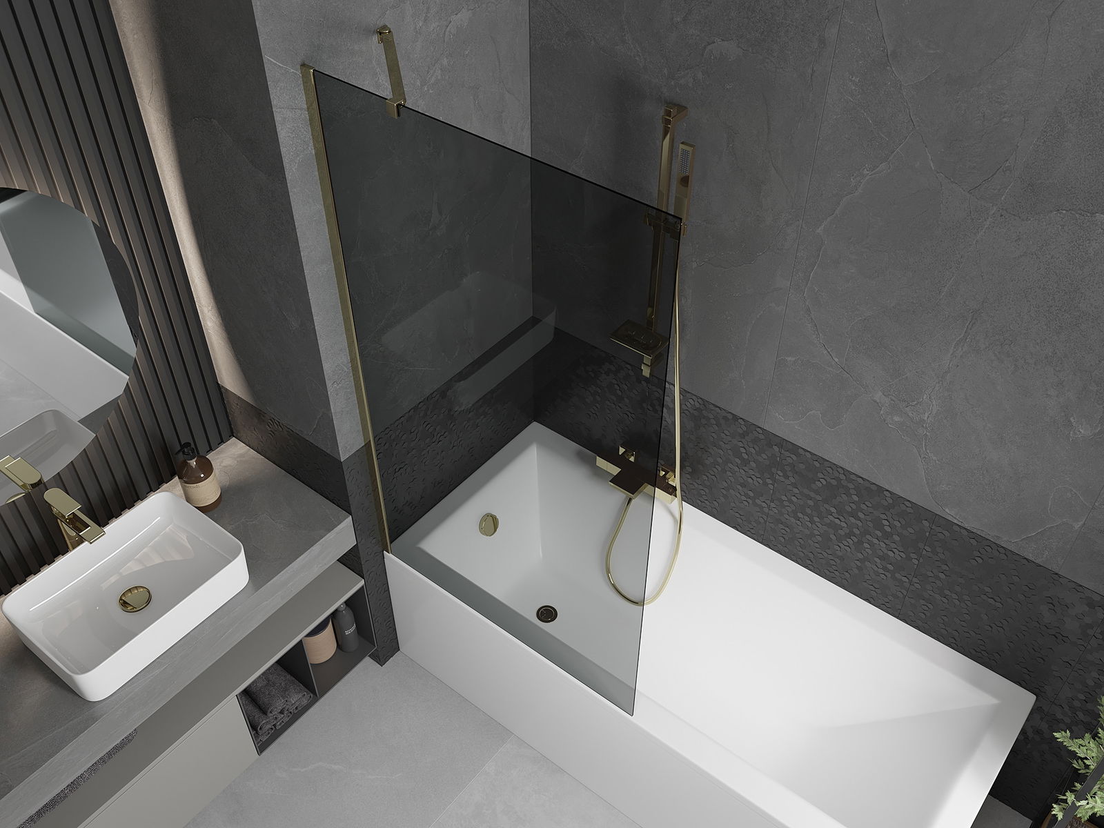 Mexen Next panou de duș de cadă, cu 1 ușă, 90 x 150 cm, grafit, auriu - 895-090-000-00-40-50