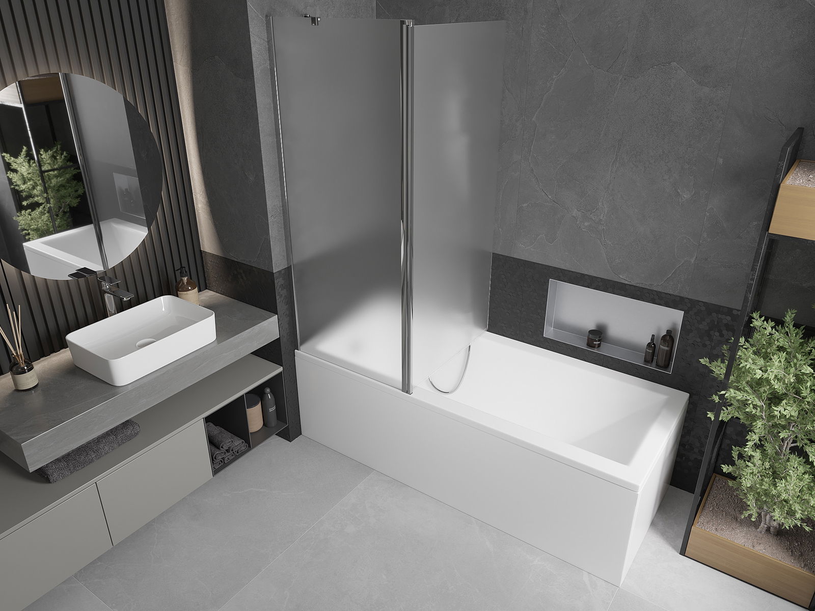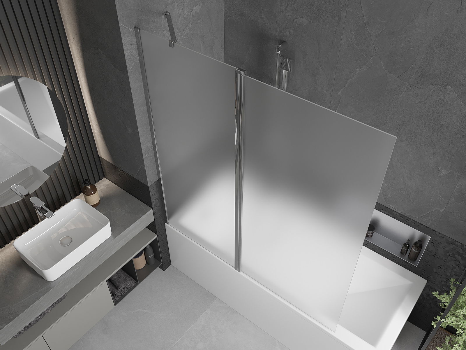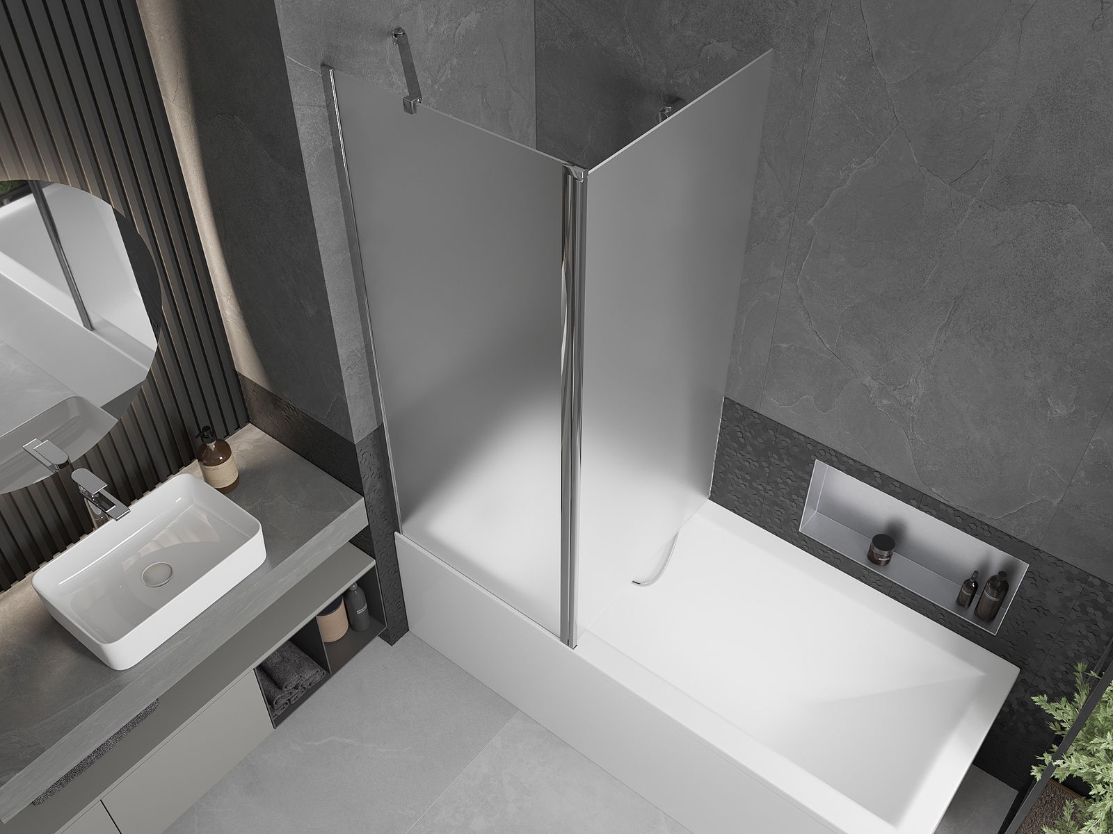 Ecranul are o aripă în mișcare cu posibilitatea de pliere. Această soluție economisește mai mult spațiu în baie și vă permite să utilizați liber spațiul rămas atunci când nu folosim zona de baie.