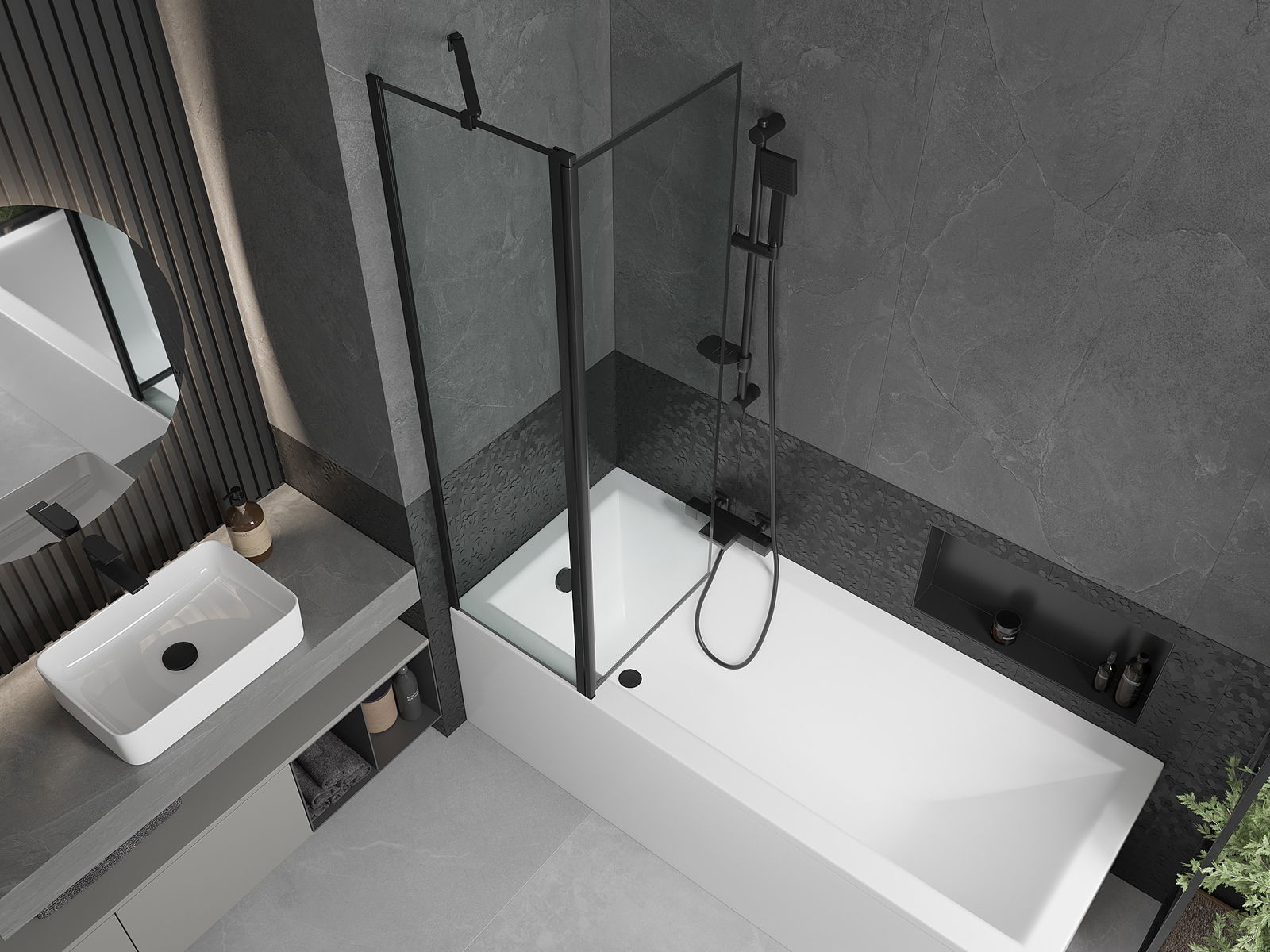 Paravanul are un singur canat mobil cu posibilitatea de a se plia. Această soluție permite economisirea mai multor spații în baie și permite utilizarea liberă a spațiului rămas atunci când nu folosim zona de baie.
