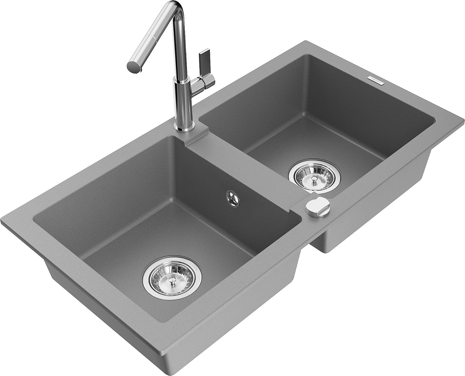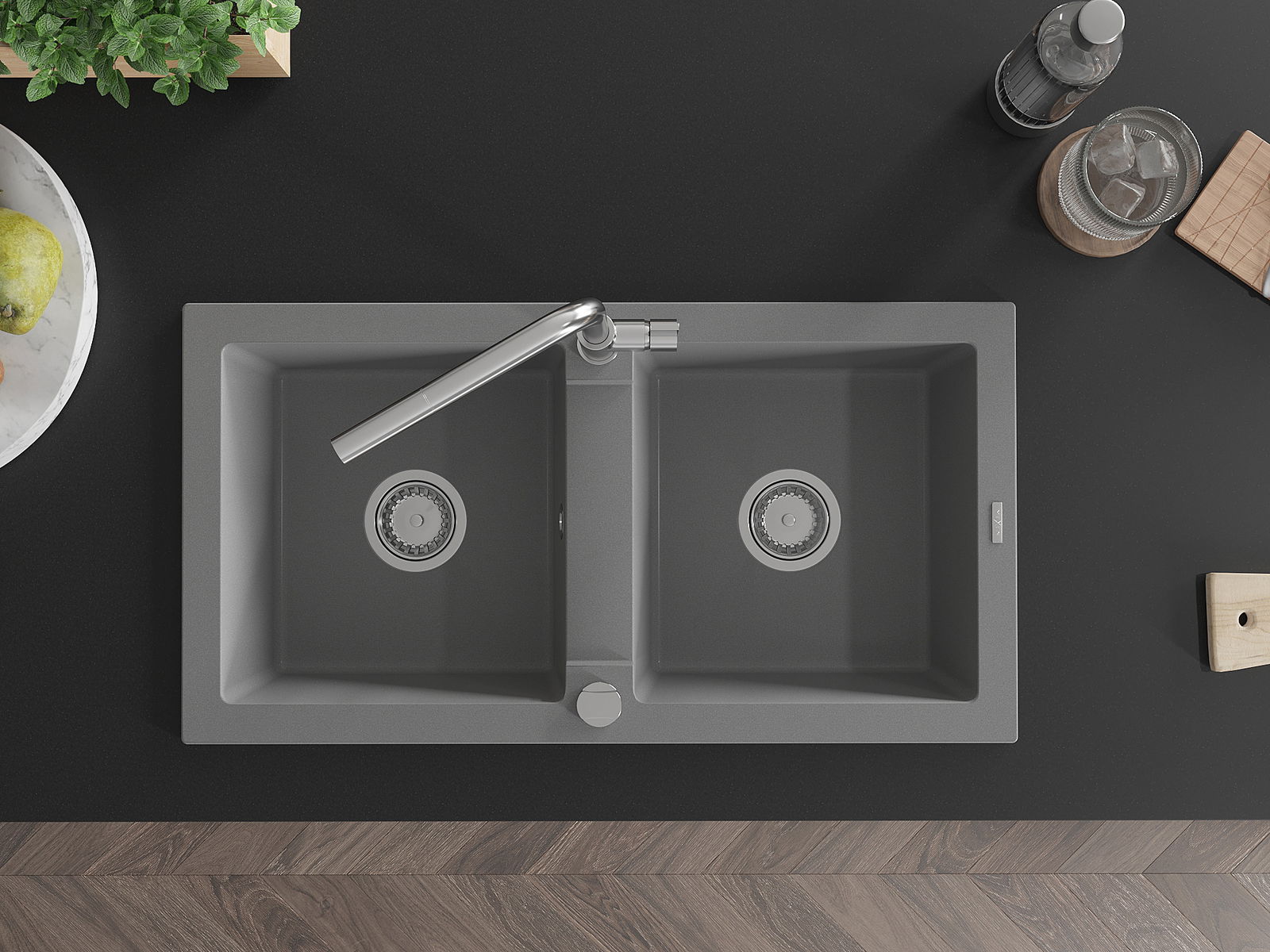 Mexen Mario chiuvetă de granit cu 2 compartimente cu baterie de bucătărie Flora, gri - 6504-71-670401-00