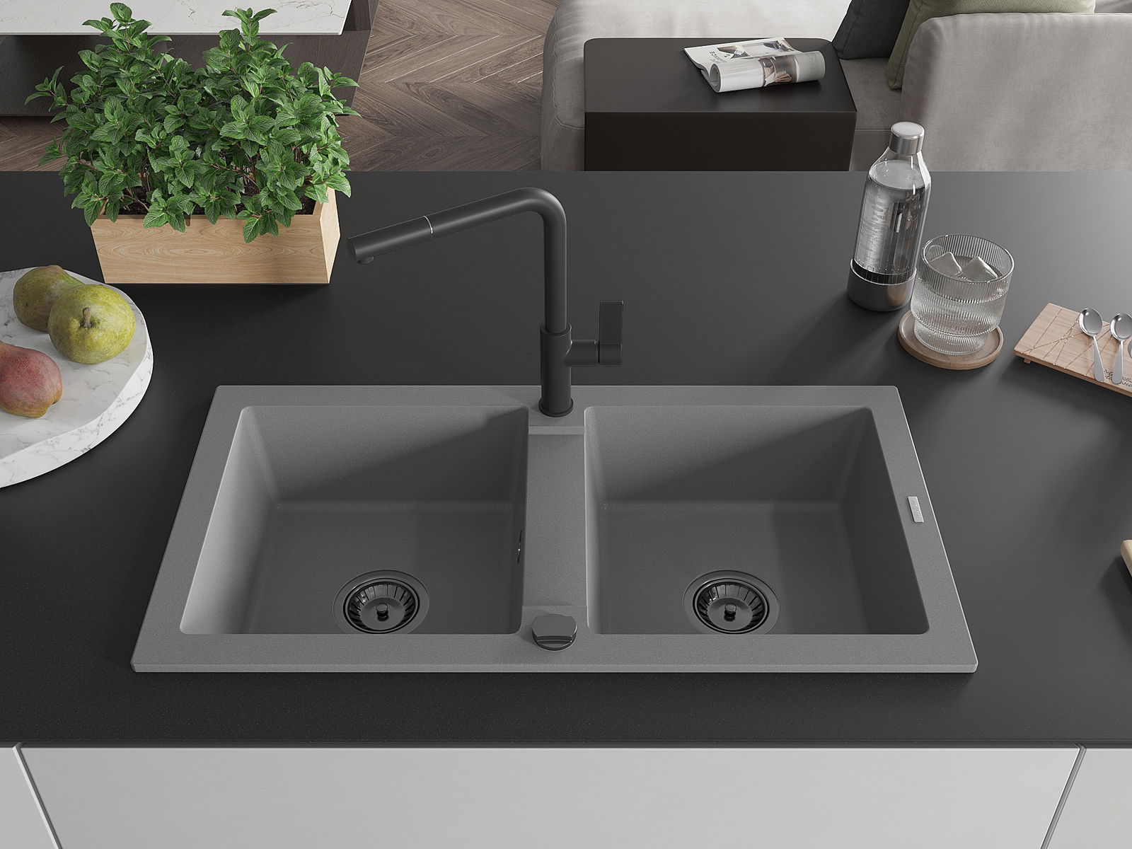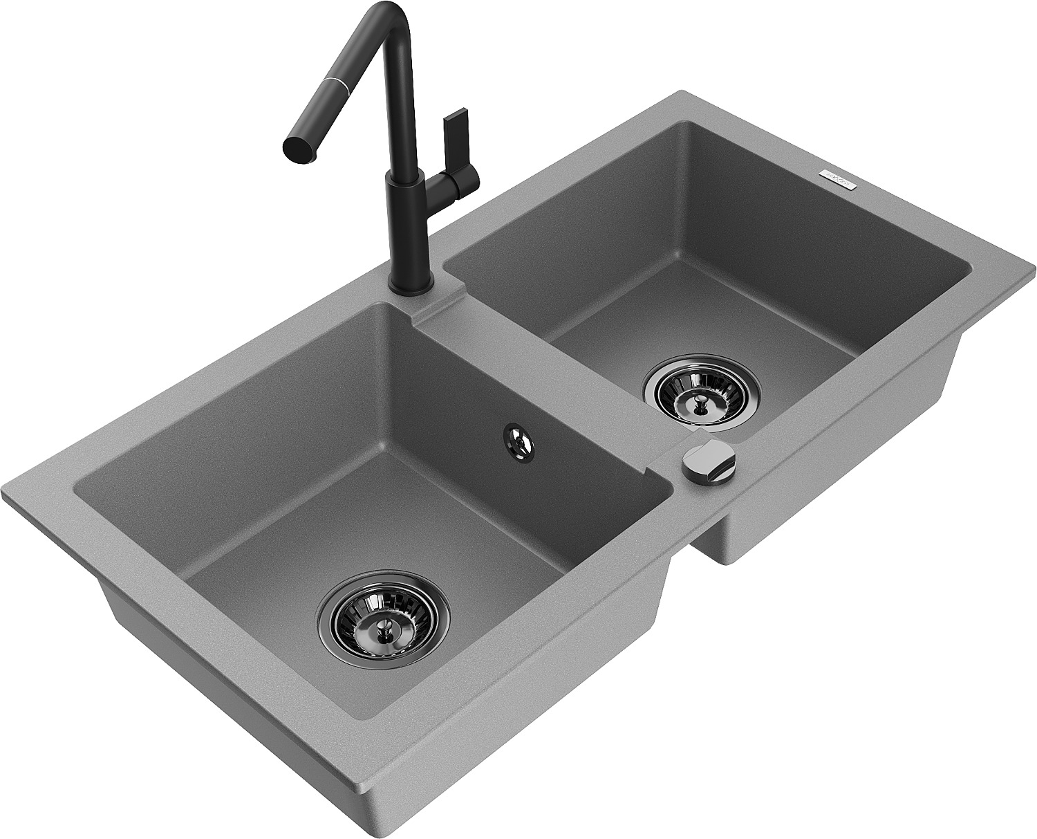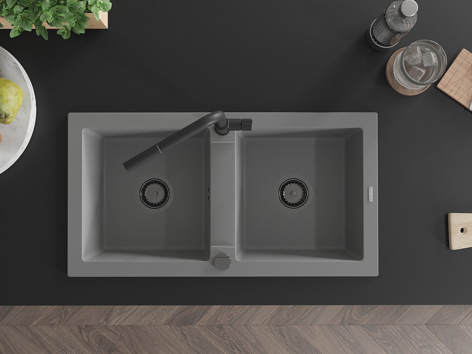 Mexen Mario chiuvetă de granit cu 2 compartimente cu baterie de bucătărie Flora, gri - 6504-71-670401-70-B