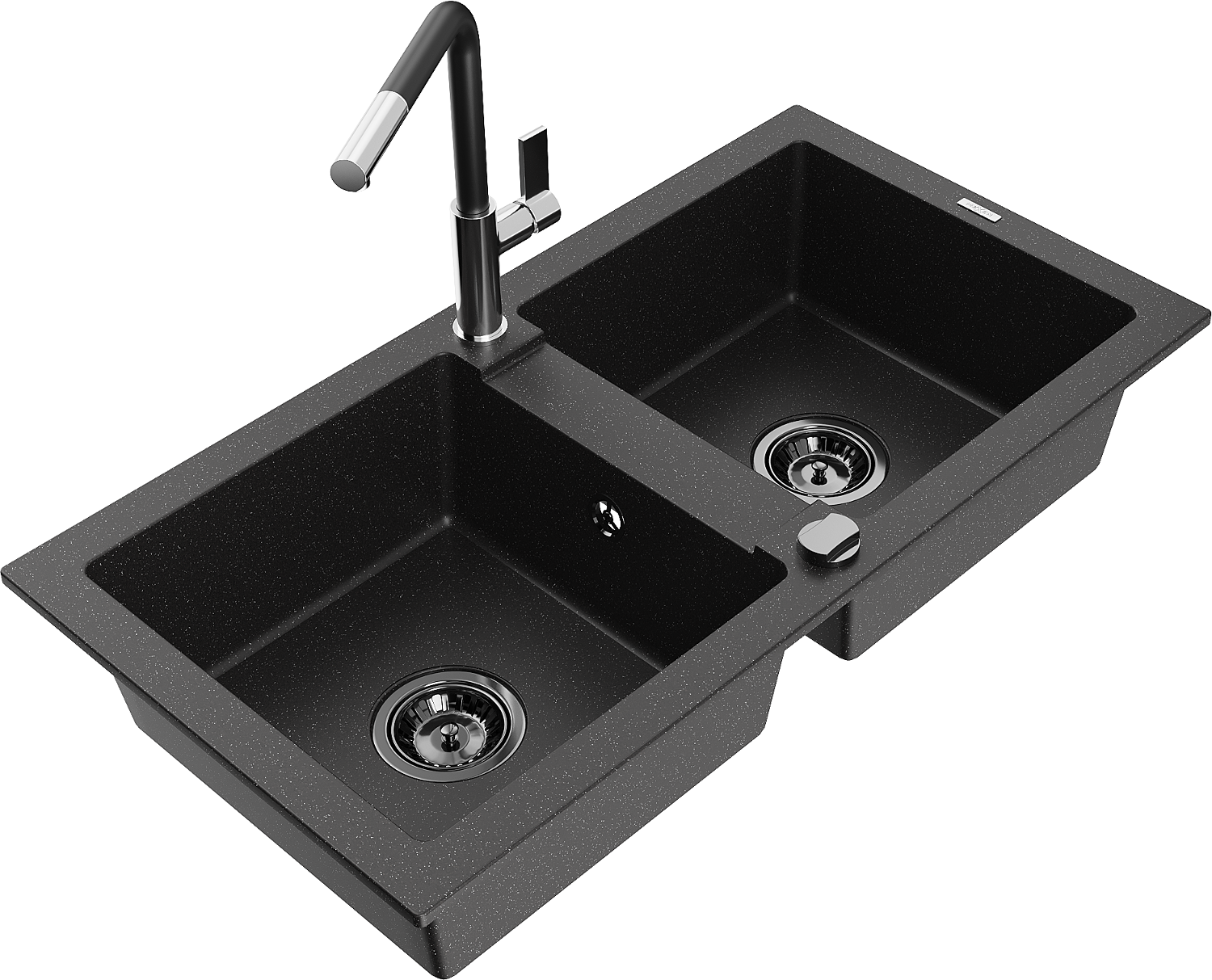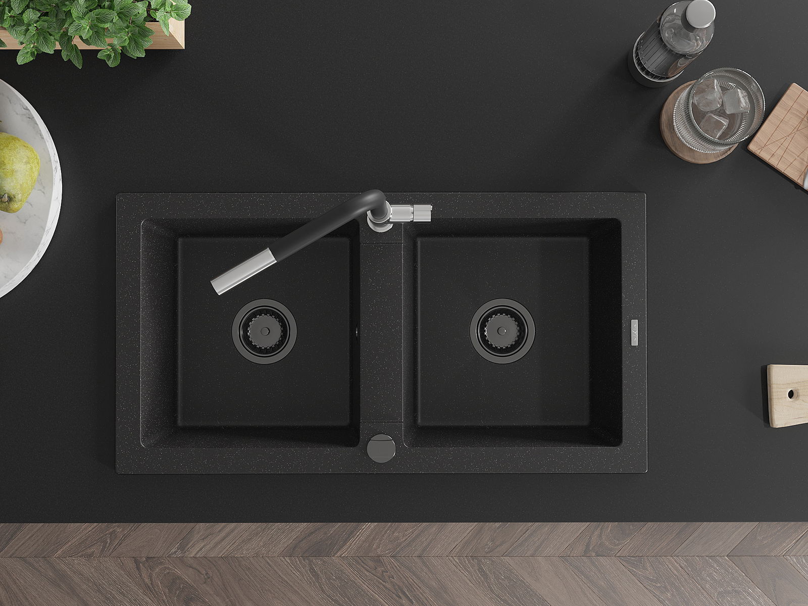 Mexen Mario chiuvetă de granit cu 2 compartimente și baterie de bucătărie Flora, negru/argintiu metalizat - 6504-73-670401-07-B