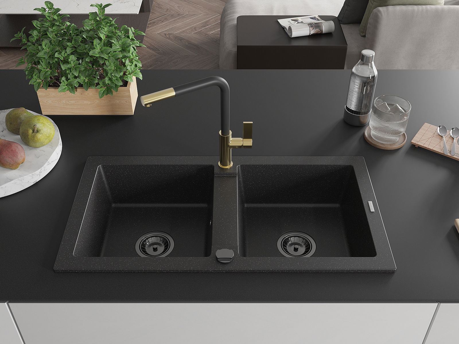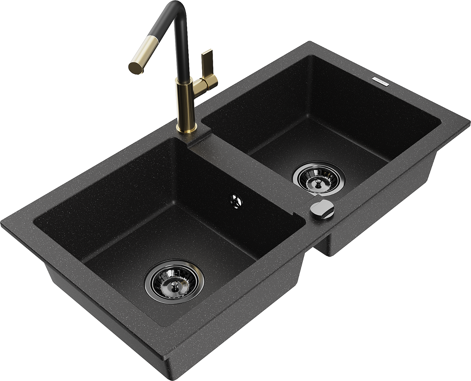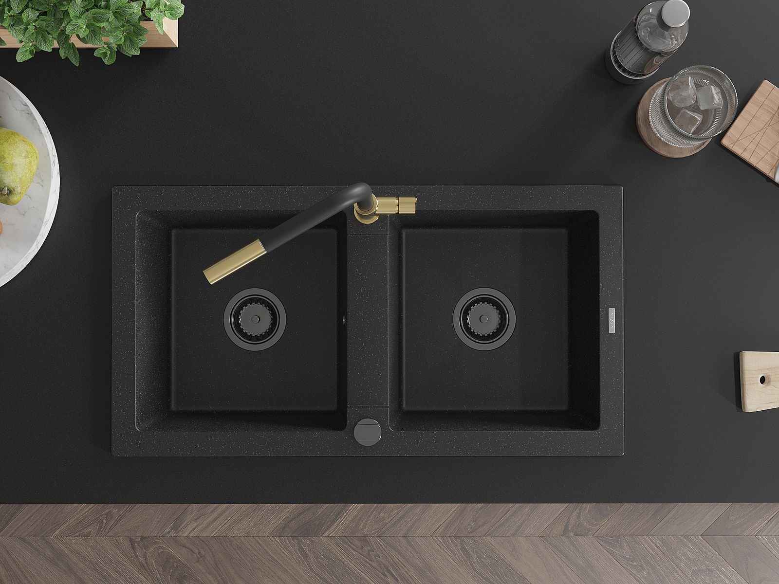 Mexen Mario chiuvetă granit cu 2 cuve și robinet de bucătărie Flora, negru/argintiu metalic - 6504-73-670401-57-B