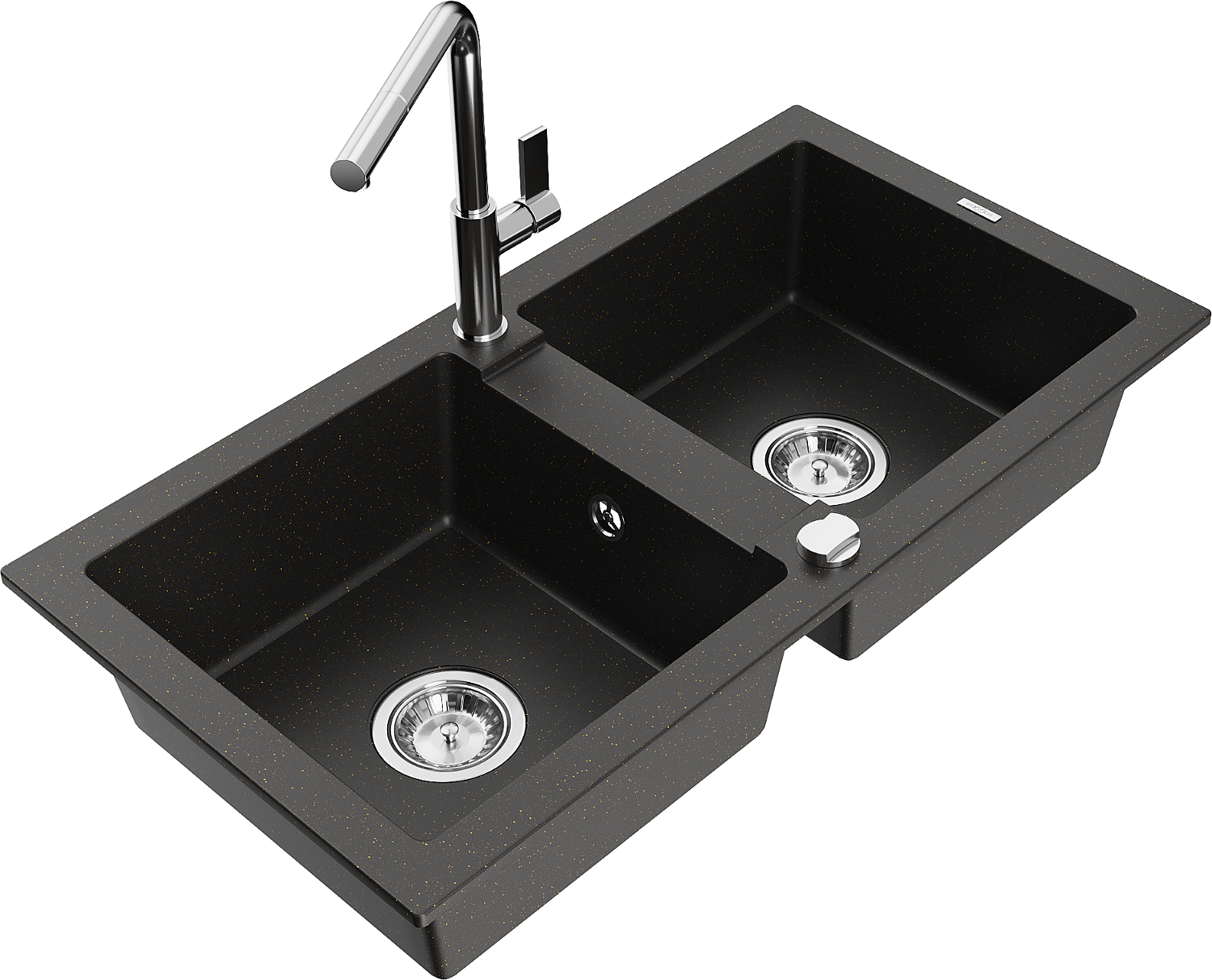 Mexen Mario chiuvetă de granit cu 2 cuve cu baterie de bucătărie Flora, negru/or metalic auriu - 6504-75-670401-00