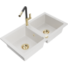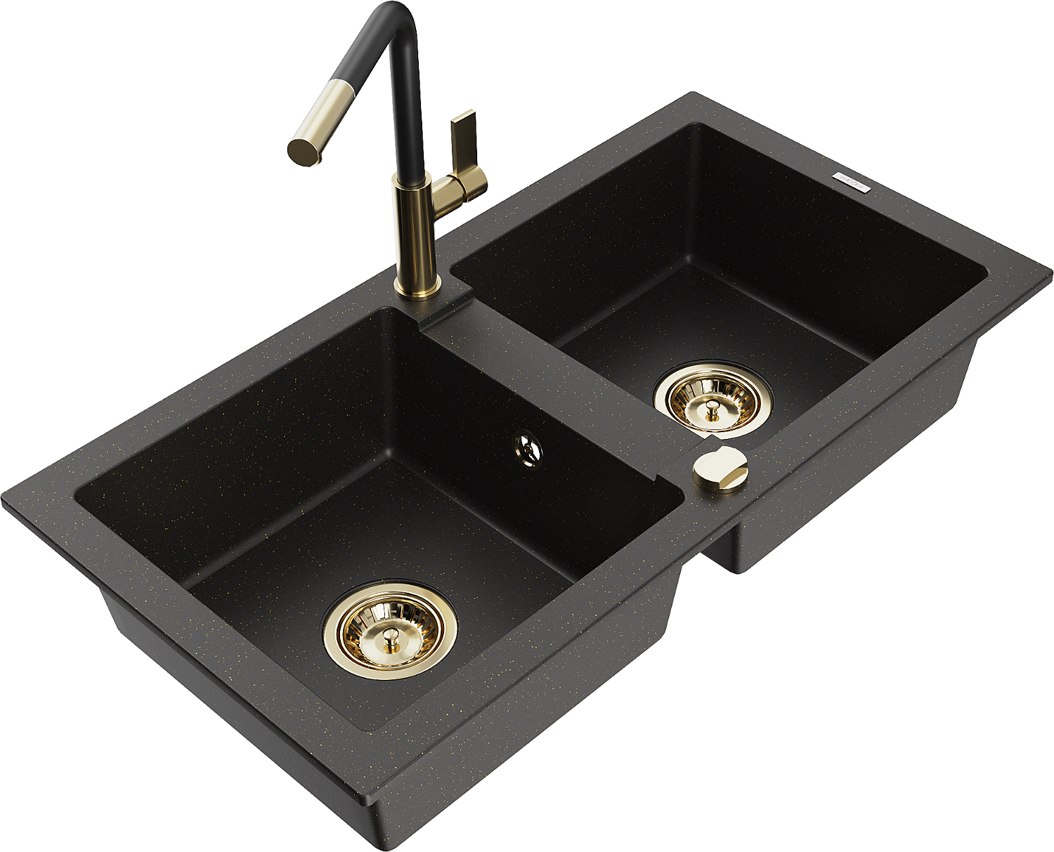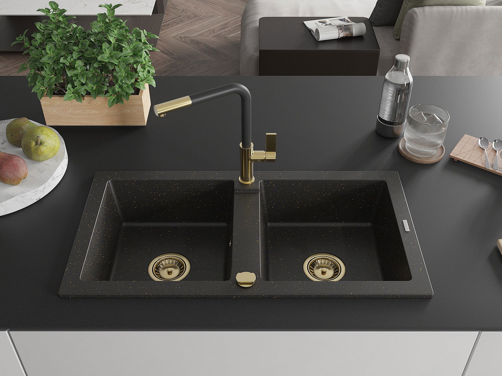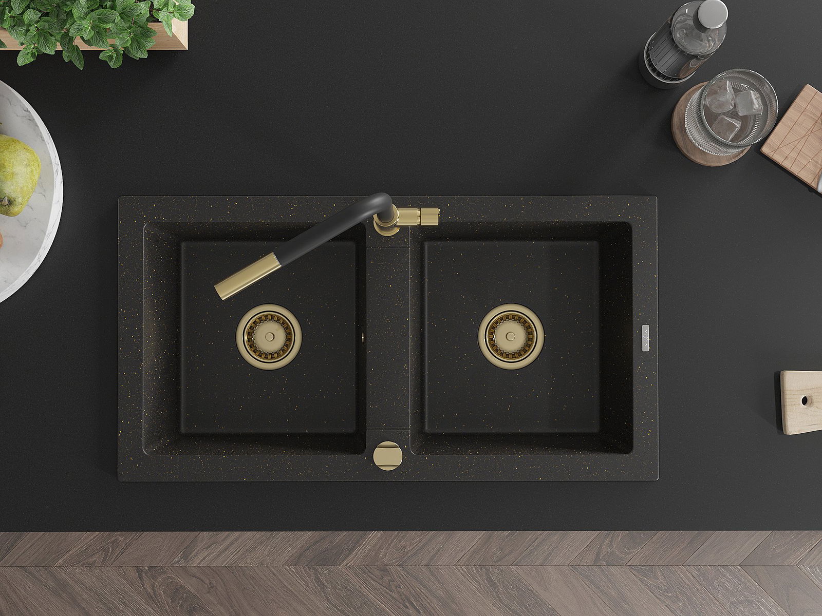 Mexen Mario chiuvetă de granit cu 2 compartimente, cu baterie de bucătărie Flora, neagră/aurie metalizat - 6504-75-670401-57-G