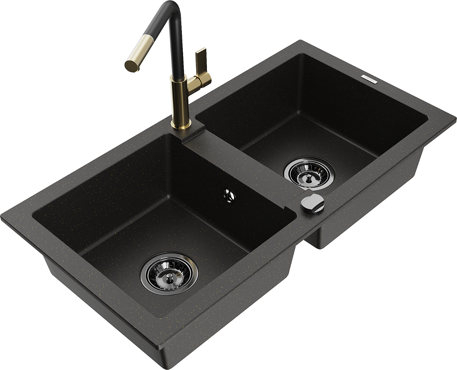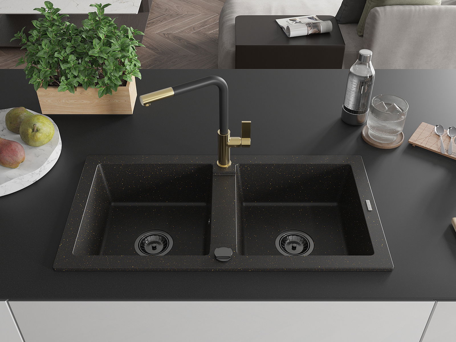 Mexen Mario chiuvetă de bucătărie din granit cu 2 compartimente și baterie Flora, negru/auriu metalic - 6504-75-670401-57-B