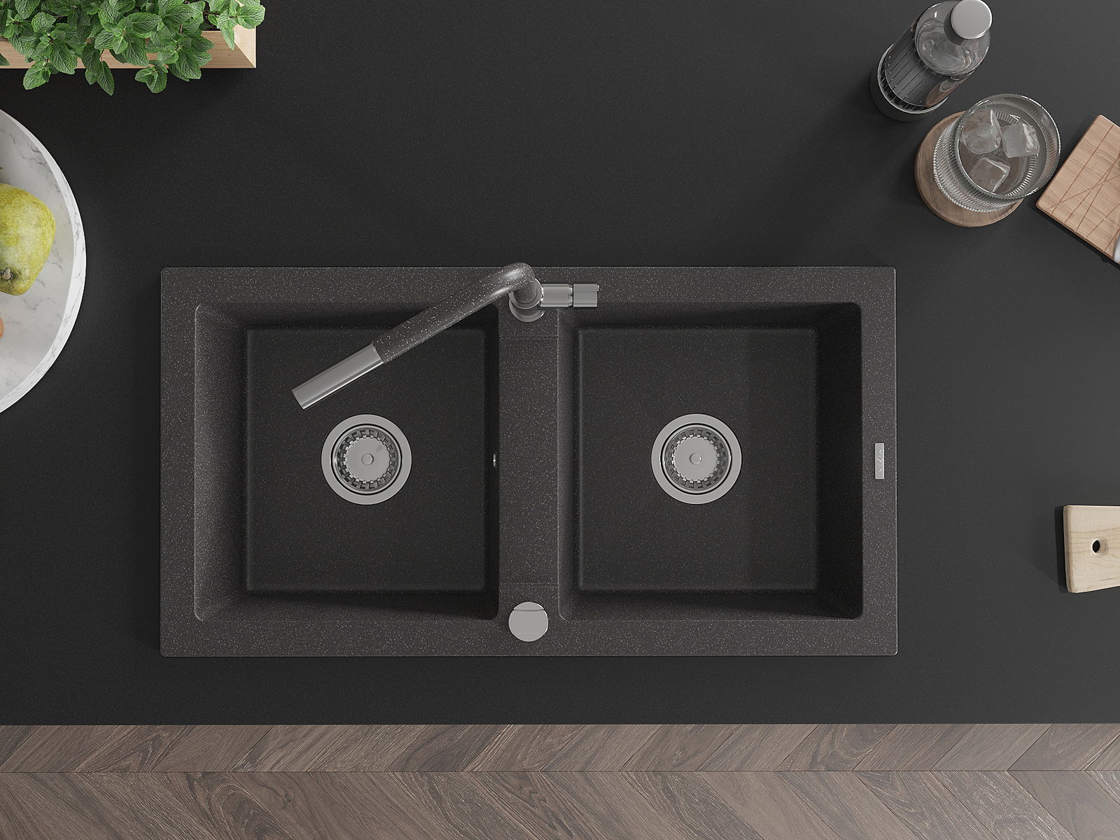 Mexen Mario chiuvetă din granit cu 2 compartimente cu baterie de bucătărie Flora, negru cu picățele - 6504-76-670401-08