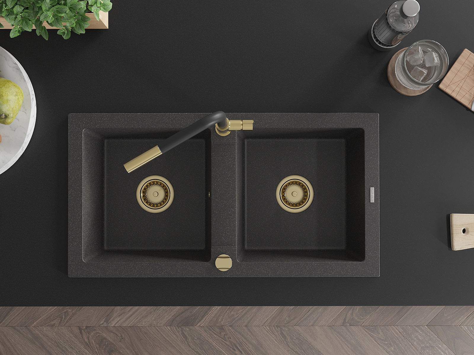 Mexen Mario chiuvetă din granit cu 2 compartimente și baterie de bucătărie Flora, neagră cu pete - 6504-76-670401-57-G