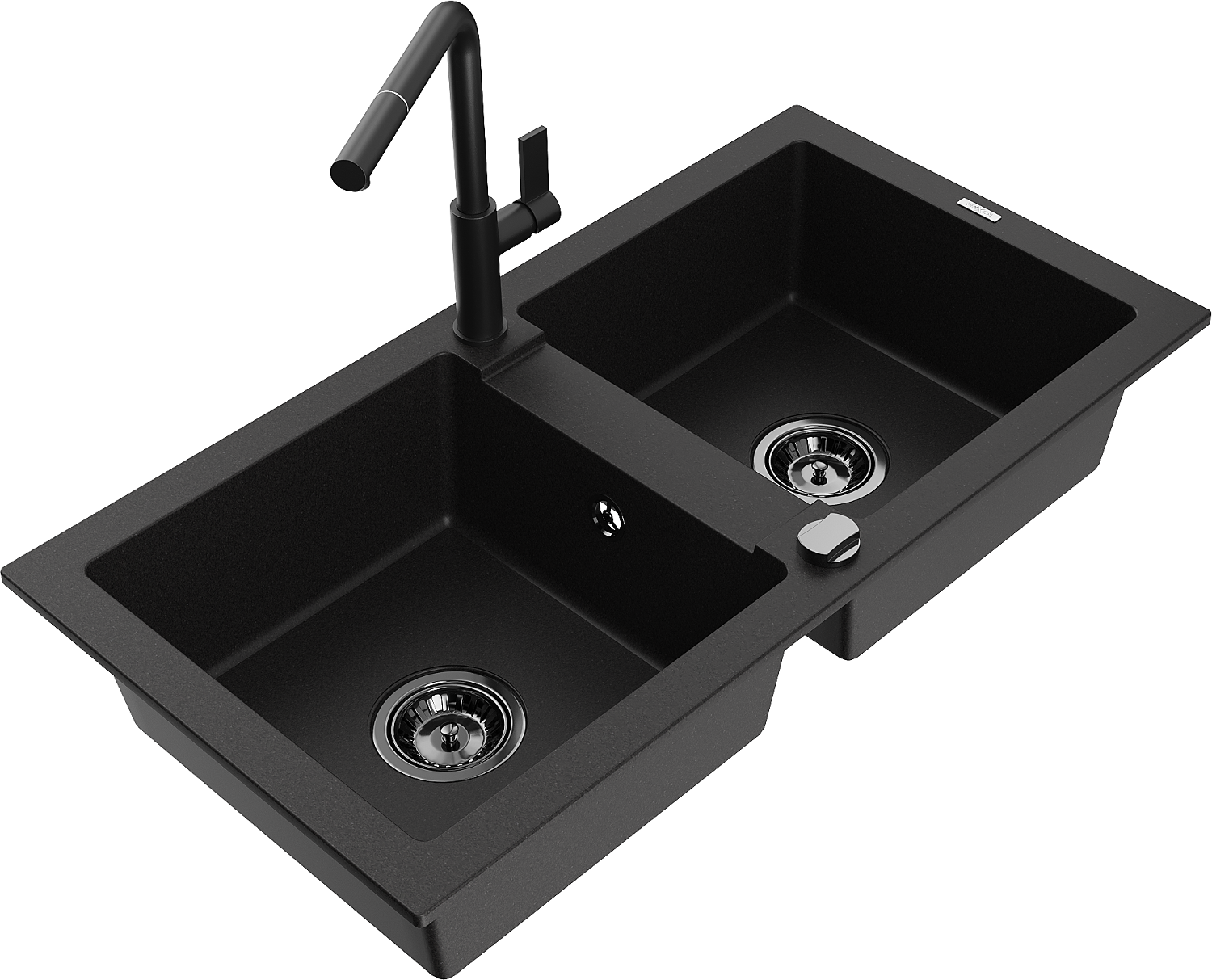 Mexen Mario chiuvetă de bucătărie din granit, cu 2 compartimente și robinet de bucătărie Flora, negru - 6504-77-670401-70-B