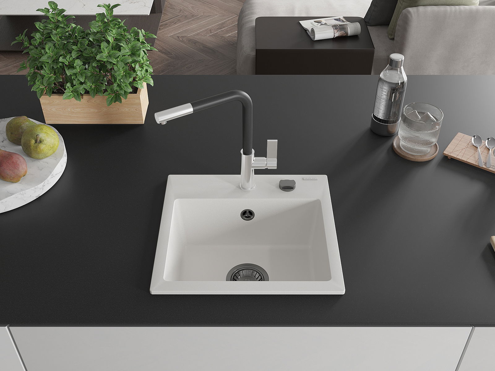 Chiuvetă granit Mexen Milo cu 1 compartiment și baterie de bucătărie Flora, alb - 6505-20-670401-07-B