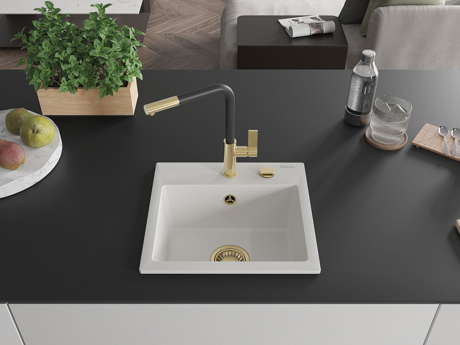 Mexen Milo chiuvetă de granit cu 1 compartiment și baterie de bucătărie Flora, alb - 6505-20-670401-57-G