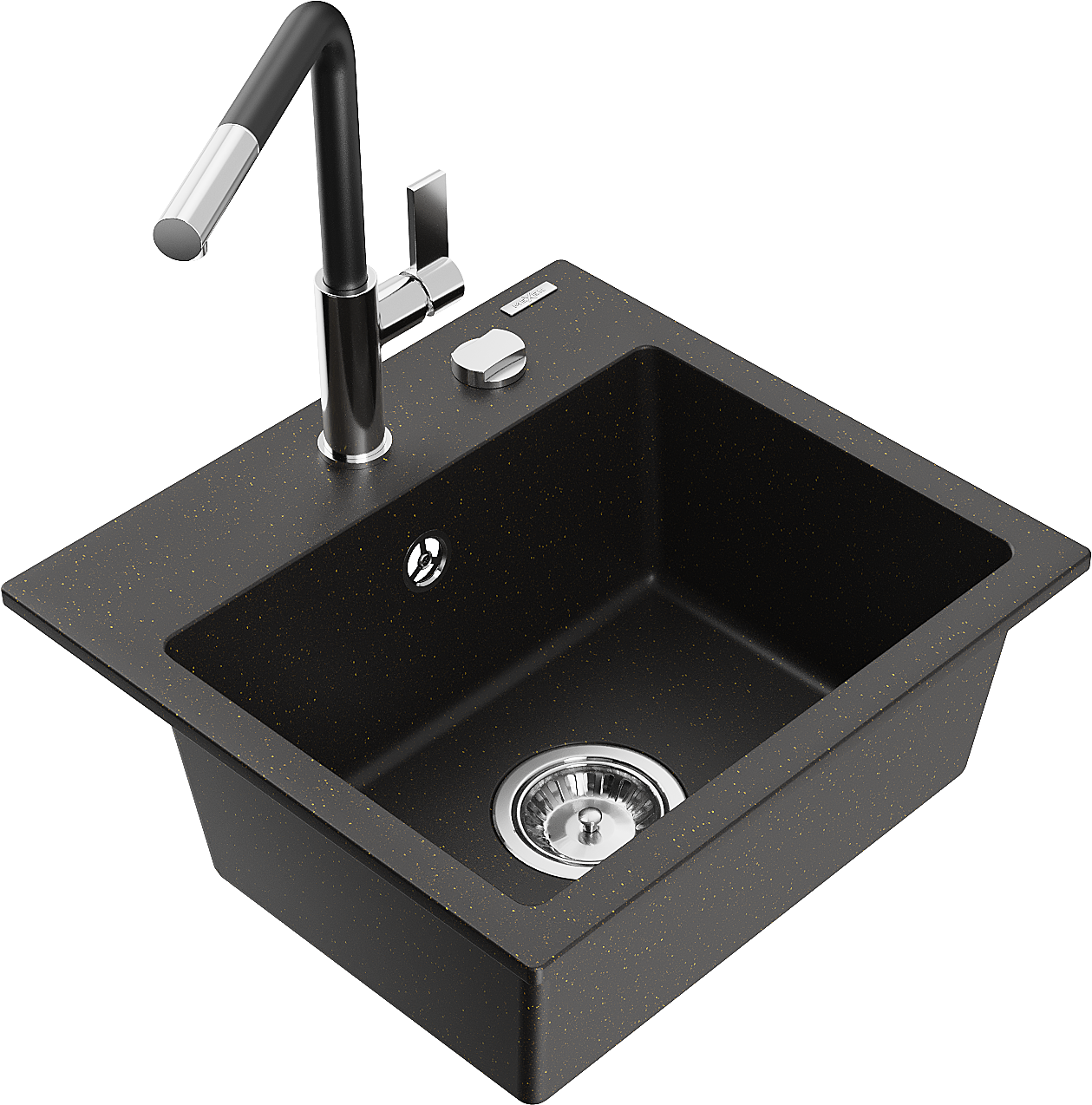 Mexen Milo chiuvetă de granit cu 1 cuvă și baterie de bucătărie Flora, negru/auriu metalic - 6505-75-670401-07
