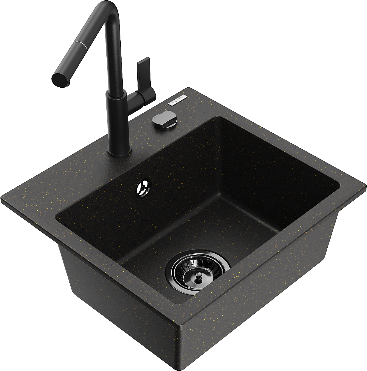 Mexen Milo chiuvetă de granit cu 1 compartiment cu baterie de bucătărie Flora, negru/auriu metalic - 6505-75-670401-70-B