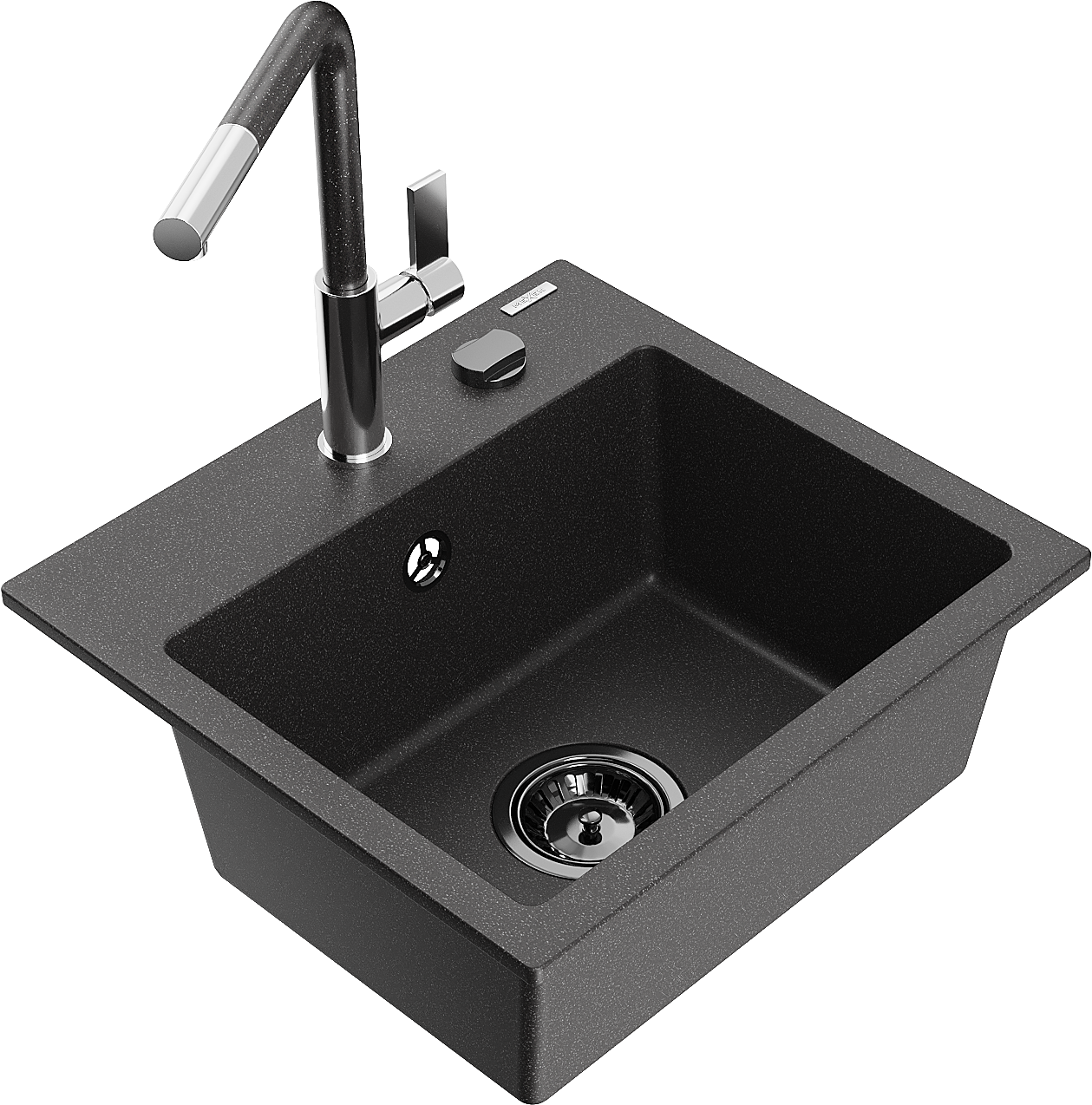 Mexen Milo chiuvetă de granit cu 1 cameră și baterie de bucătărie Flora, negru stropit - 6505-76-670401-08-B