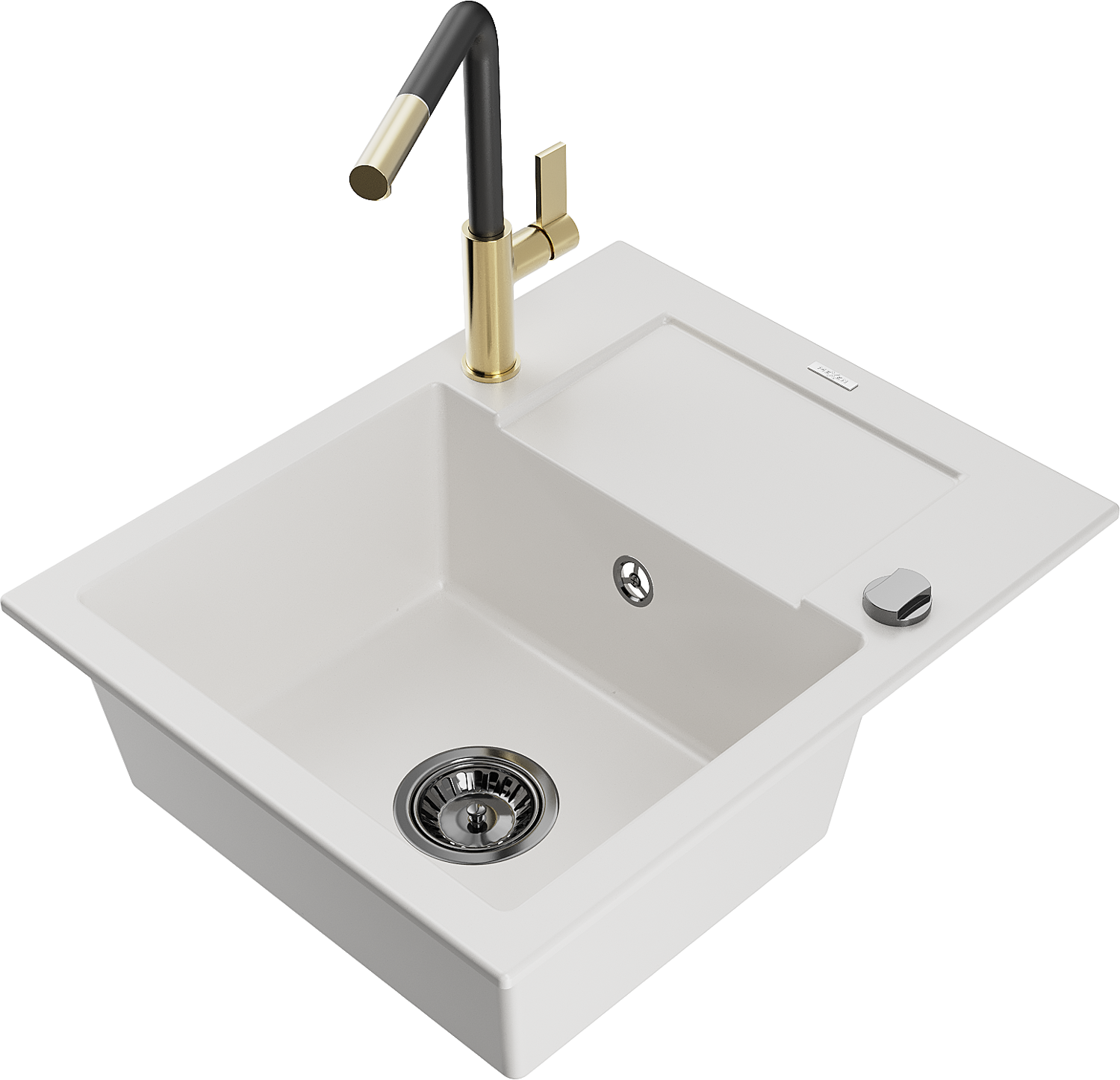 Mexen Enzo chiuvetă de bucătărie din granit cu 1 compartiment cu scurgător și baterie Flora, alb - 6506-20-670401-57-B