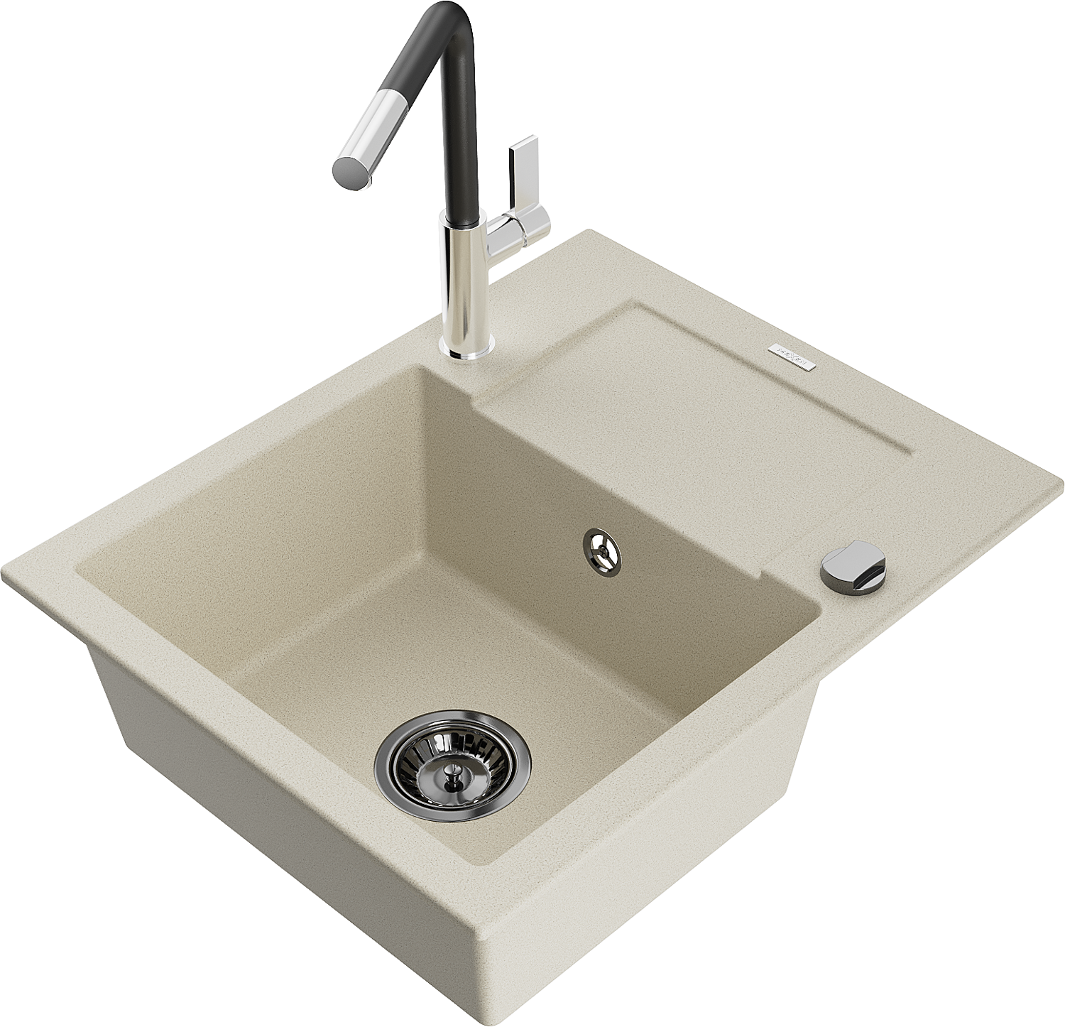 Mexen Enzo chiuvetă de granit cu 1 compartiment, cu scurgător și baterie de bucătărie Flora, bej - 6506-69-670401-07-B