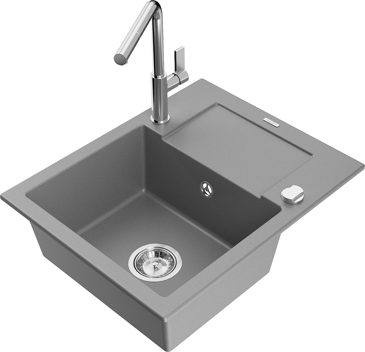 Mexen Enzo chiuvetă granit 1-cameră cu picurător și baterie de bucătărie Flora, gri - 6506-71-670401-00