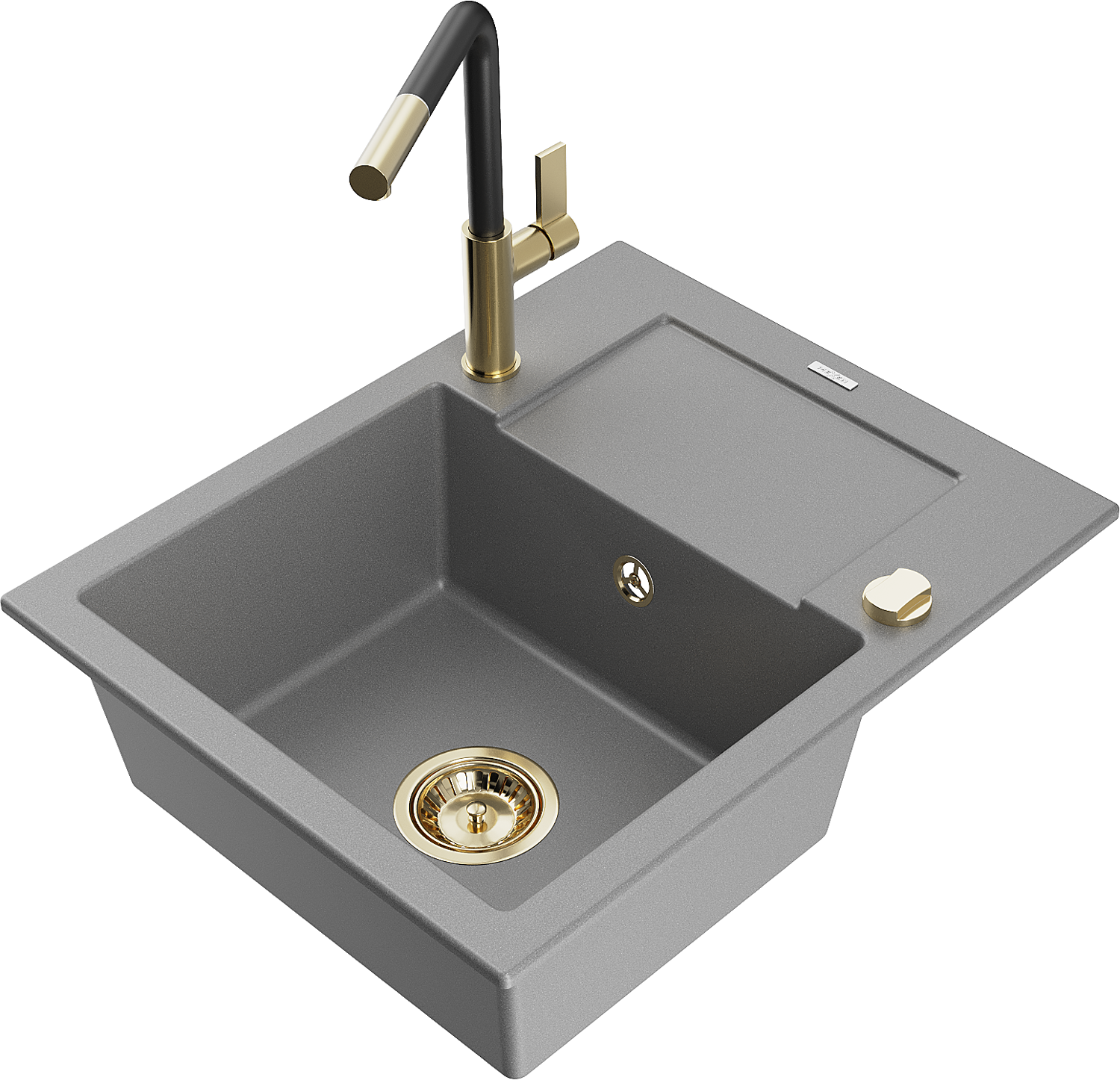 Chiuvetă de granit Mexen Enzo cu 1 cuvă, cu scurgător și baterie de bucătărie Flora, gri - 6506-71-670401-57-G