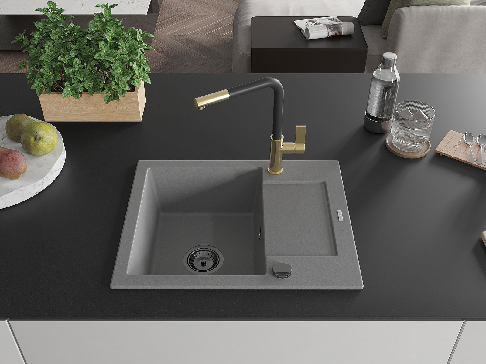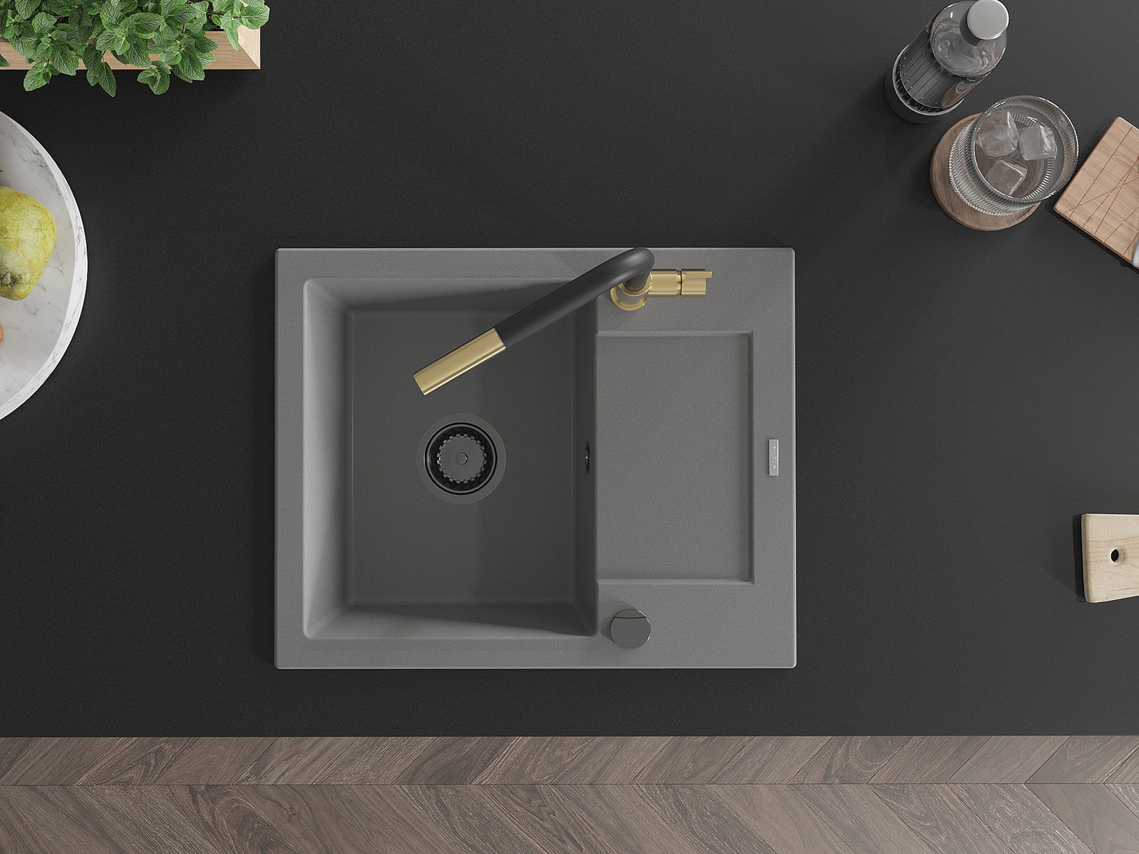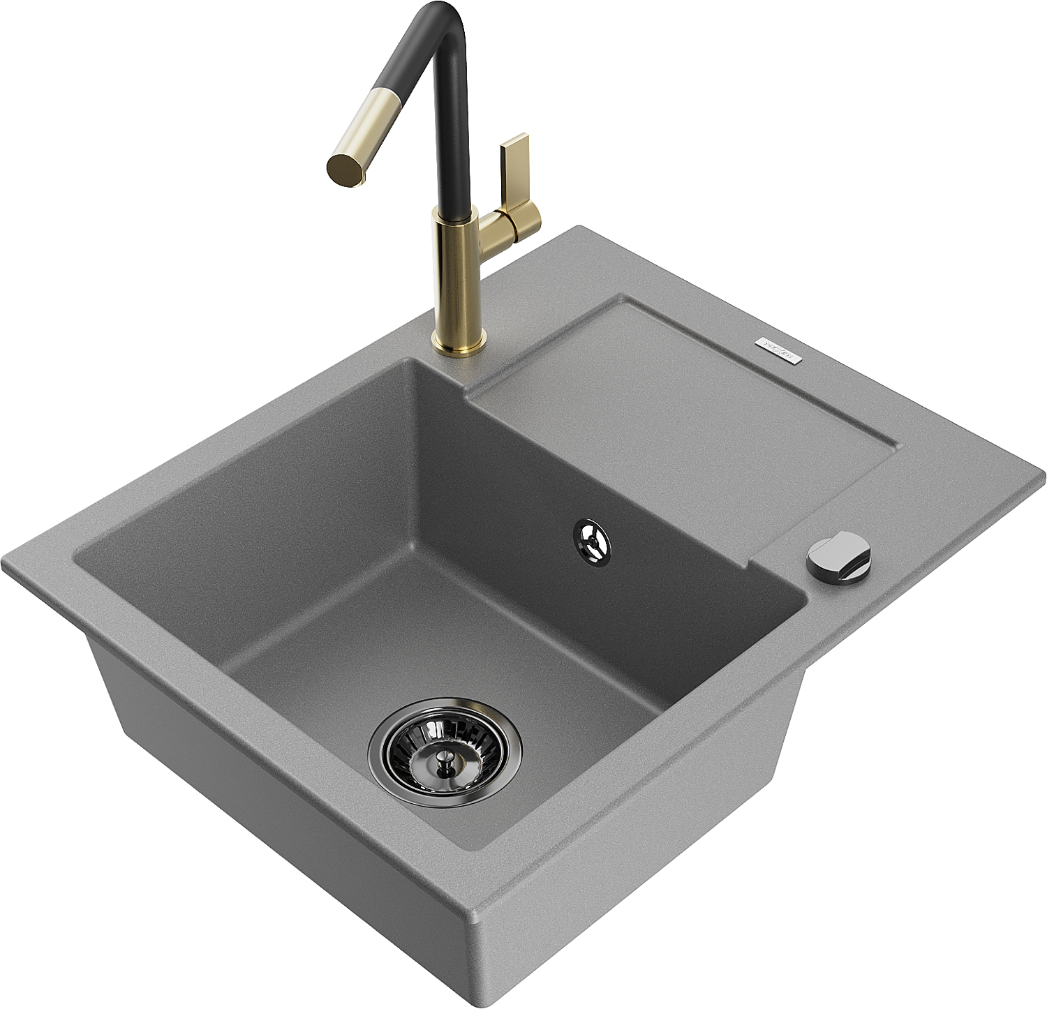 Mexen Enzo chiuvetă de granit cu 1 compartiment cu scurgător și robinet de bucătărie Flora, gri - 6506-71-670401-57-B
