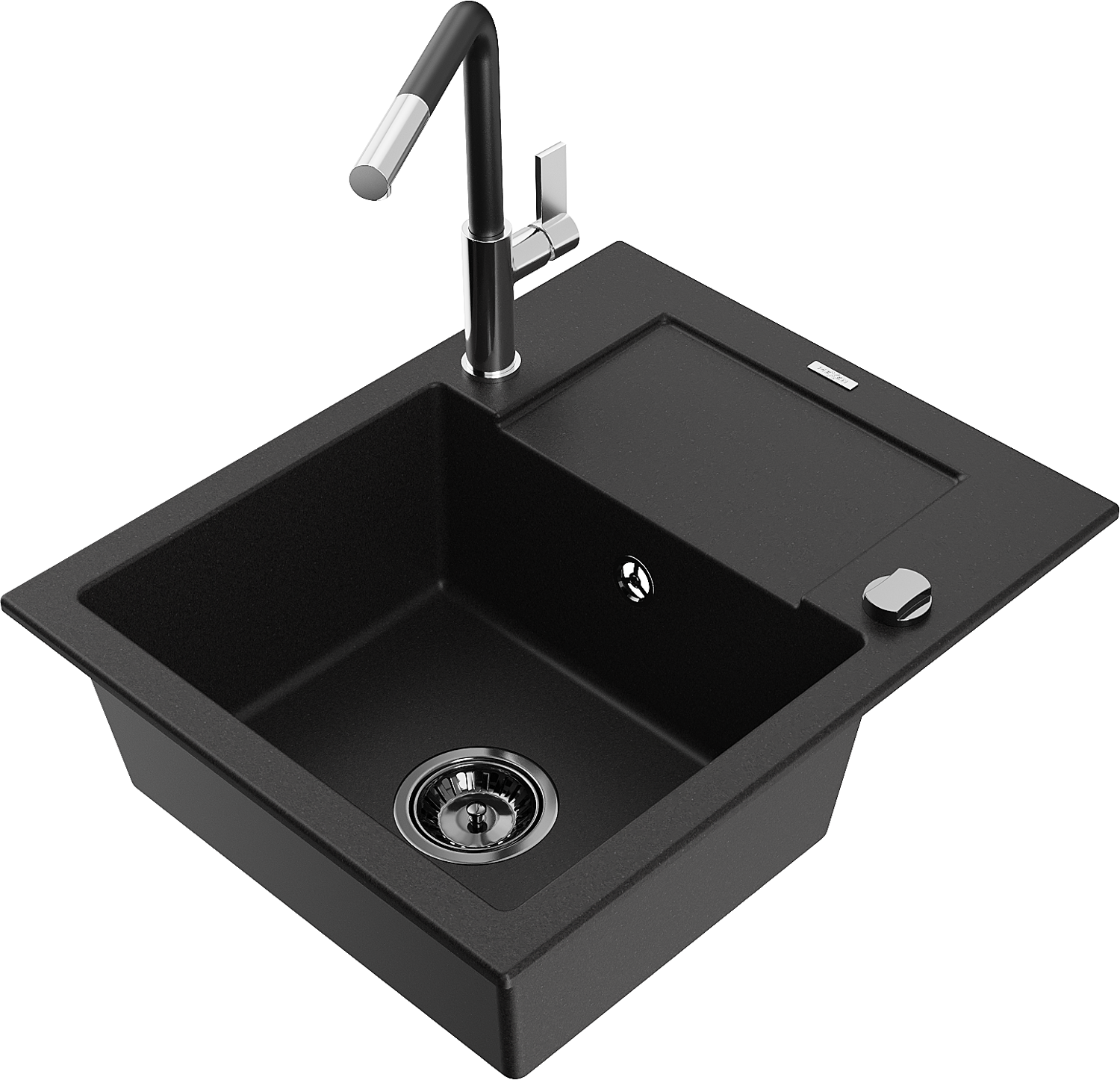 Mexen Enzo chiuvetă de bucătărie din granit cu 1 compartiment și picurător și baterie de bucătărie Flora, negru - 6506-77-67040?