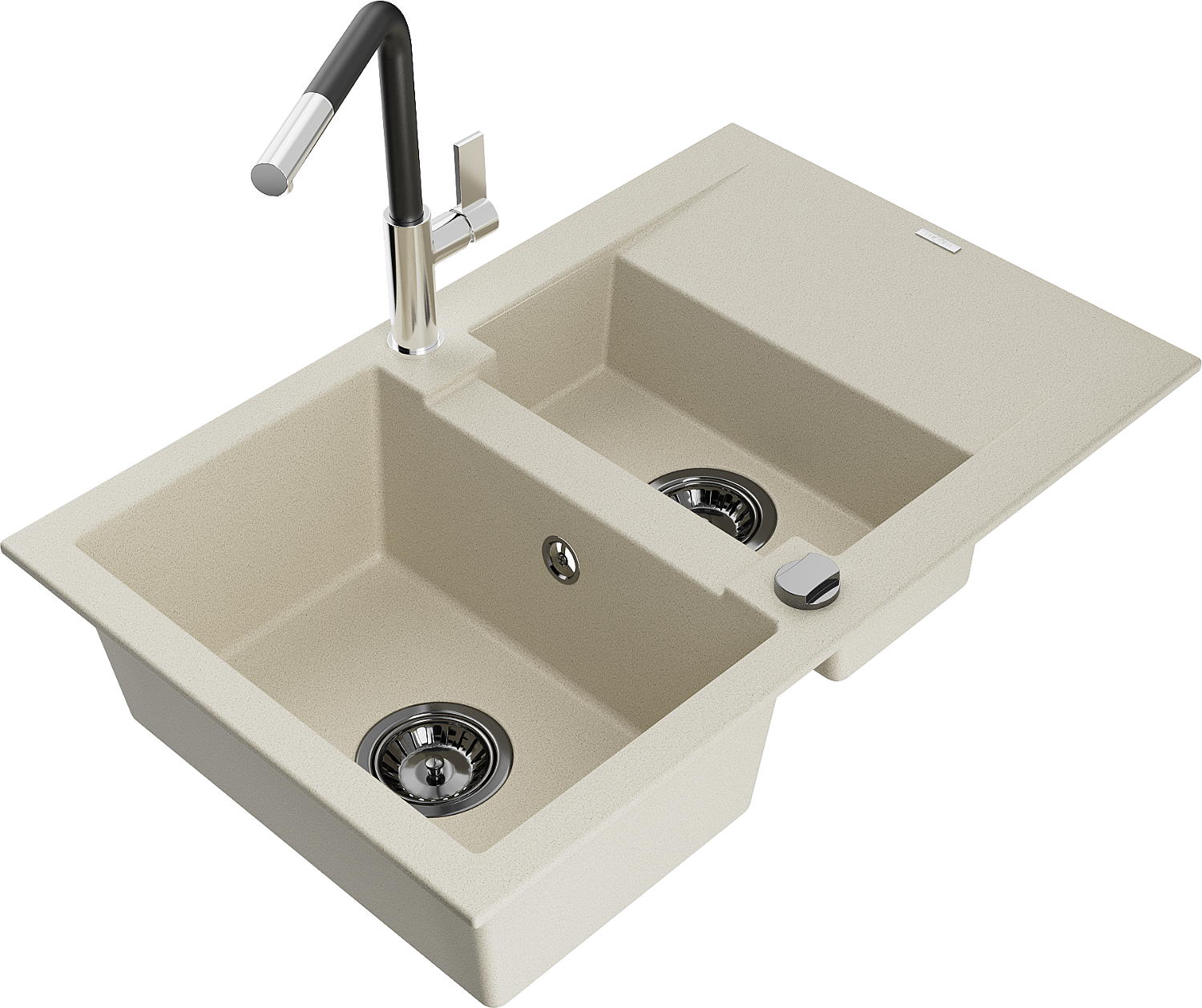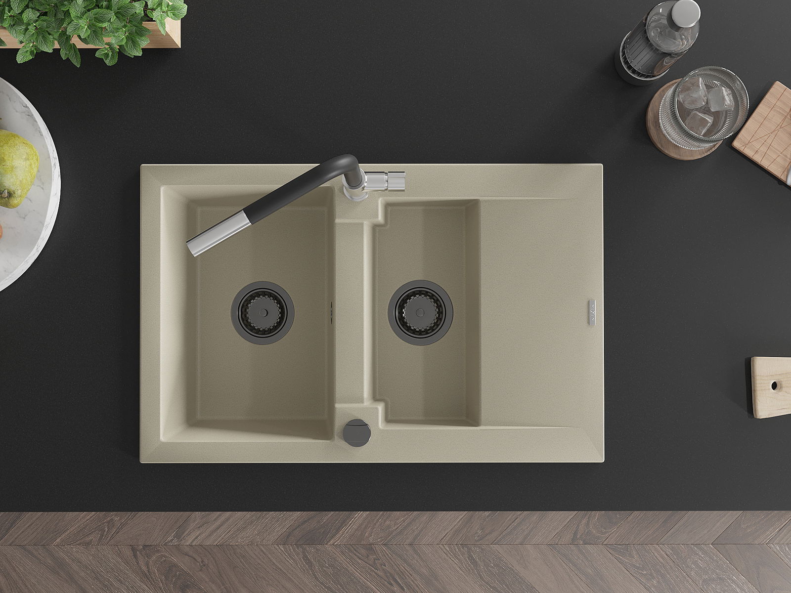 Mexen Gaspar chiuvetă de granit 1,5 compartimente cu scurgător și baterie de bucătărie Flora, bej - 6507-69-670401-07-B