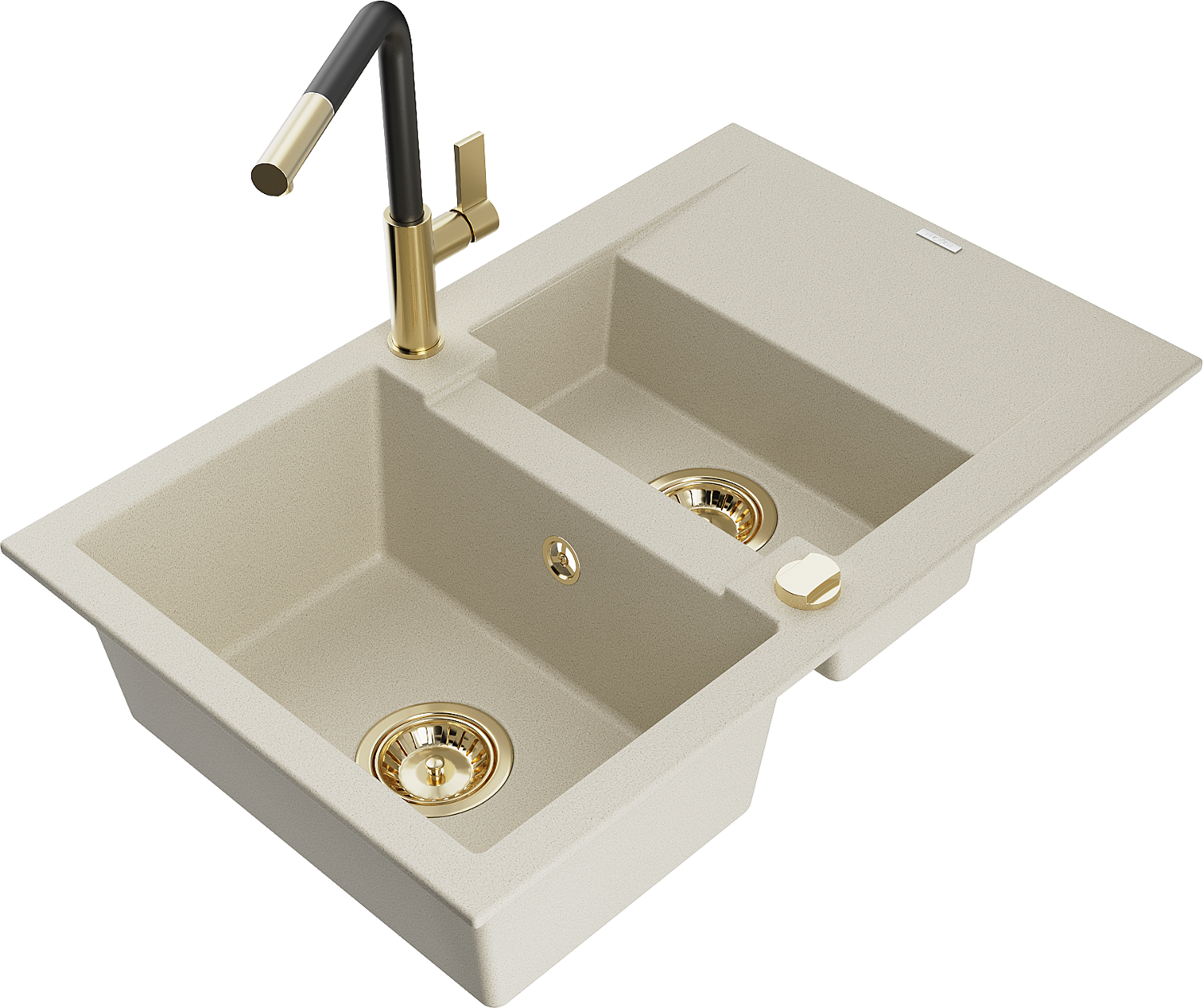 Mexen Gaspar chiuvetă de bucătărie din granit cu 1,5 compartimente, cu scurgător și baterie Flora, bej - 6507-69-670401-57-G