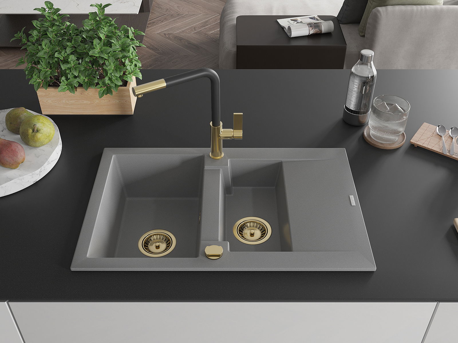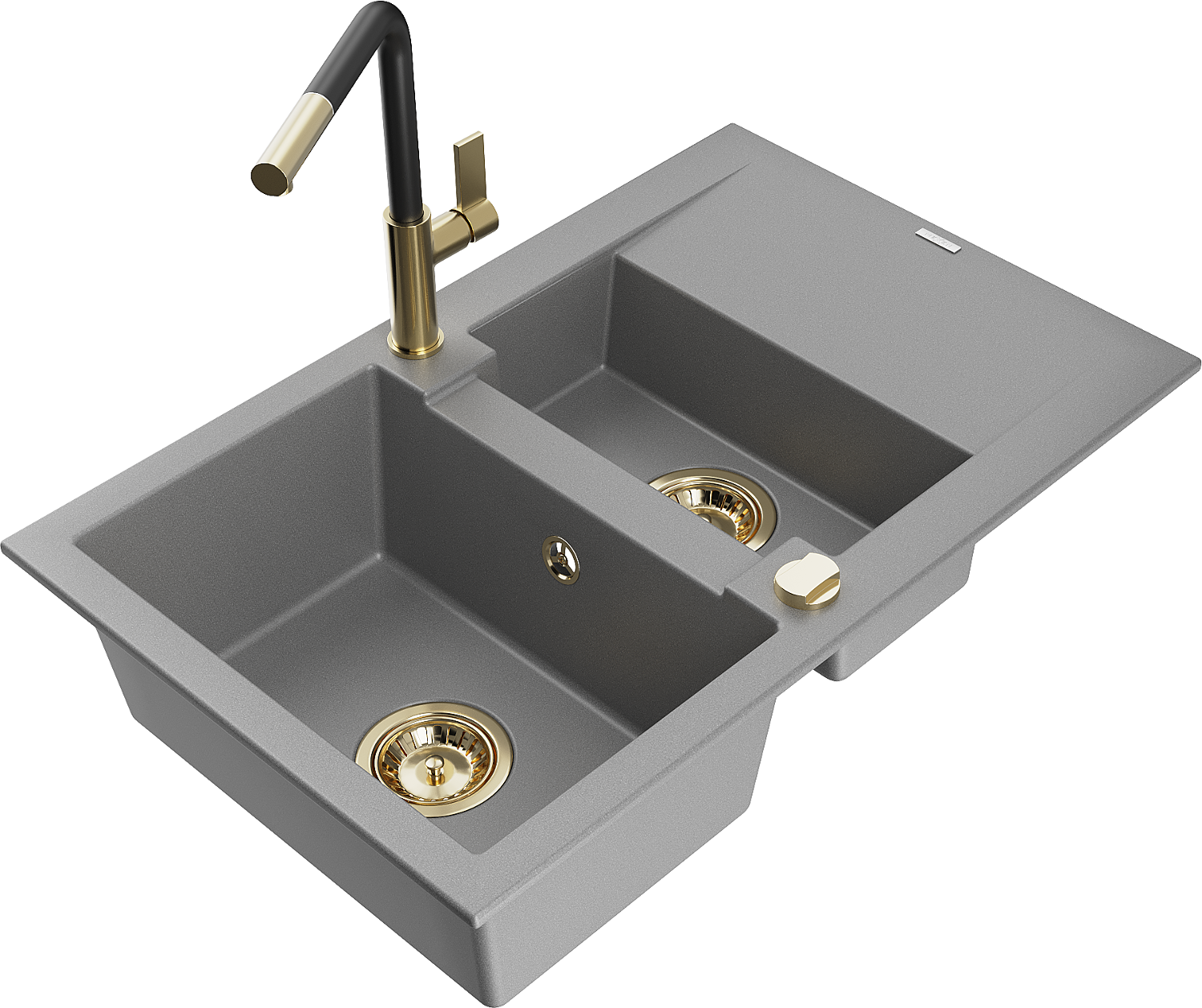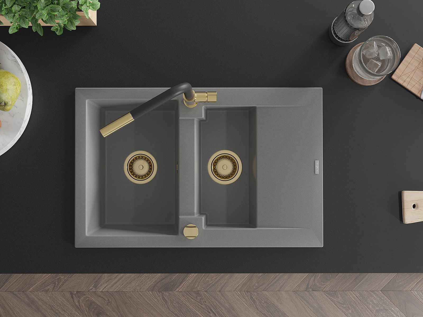 Mexen Gaspar chiuvetă de bucătărie din granit cu 1,5 compartimente cu scurgător și baterie Flora, gri - 6507-71-670401-57-G