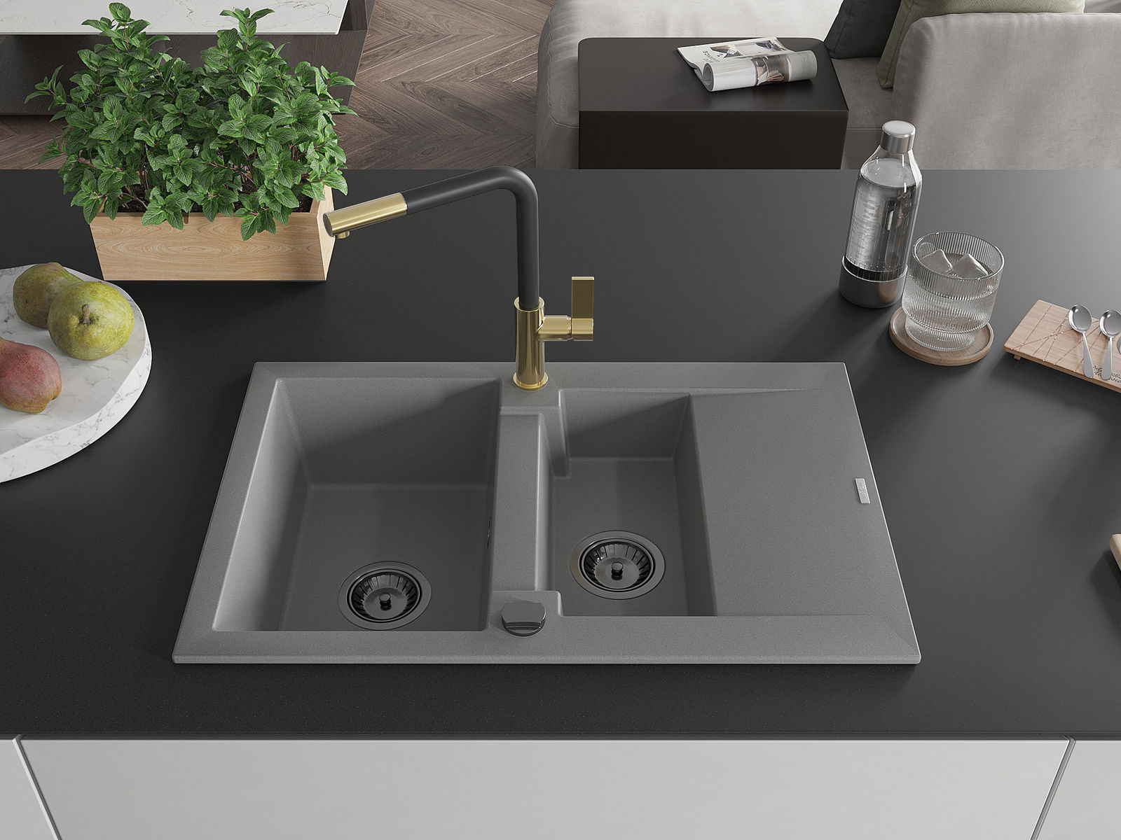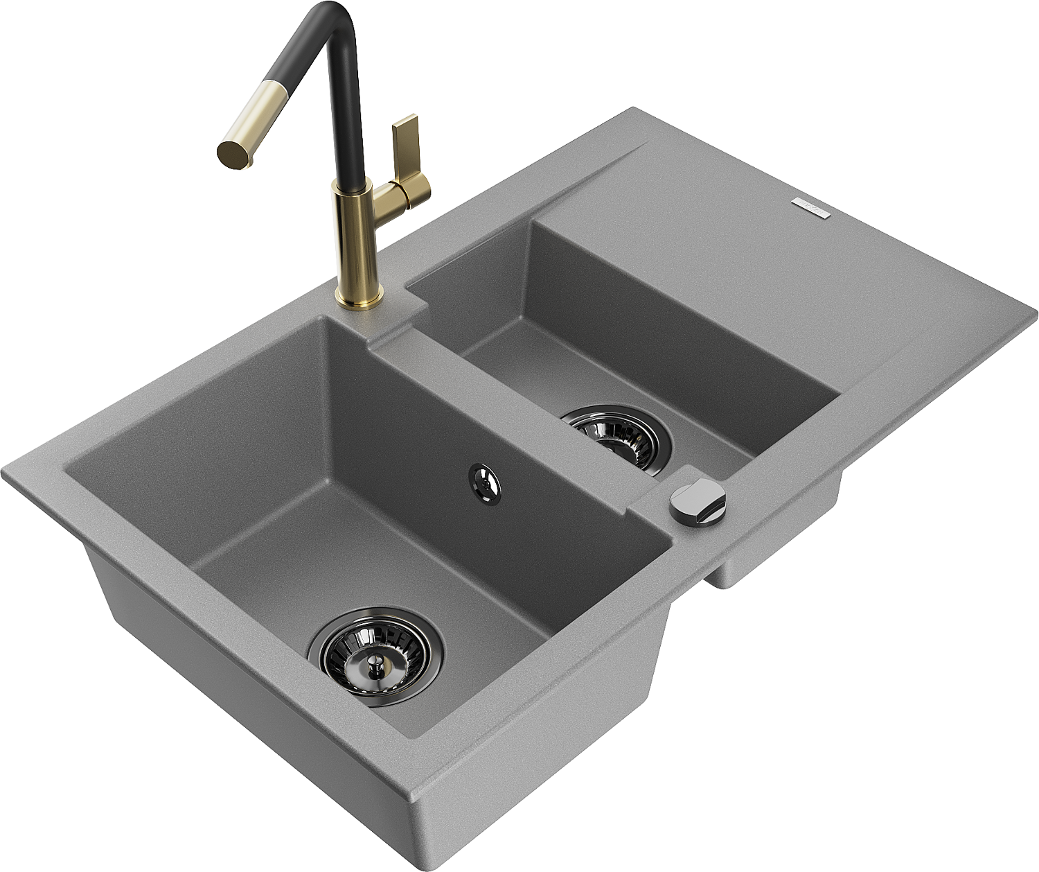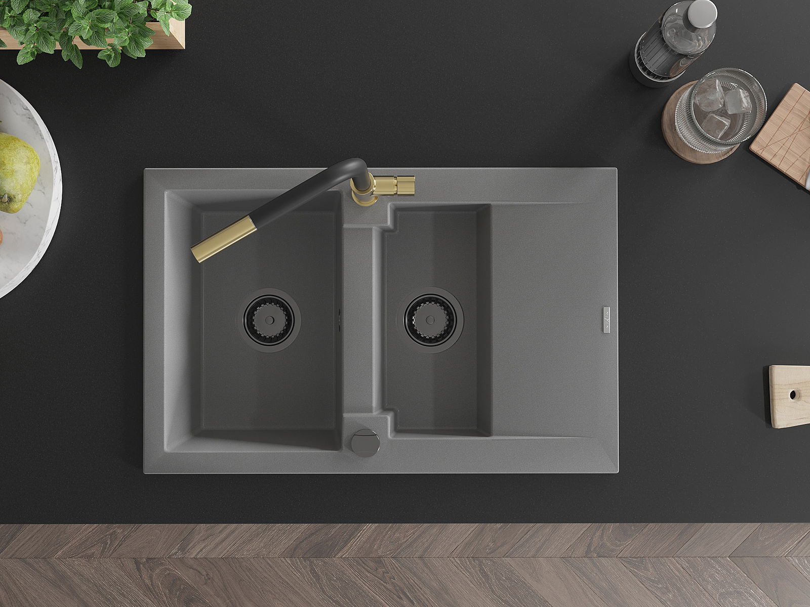 Mexen Gaspar chiuvetă de bucătărie din granit cu 1,5 compartimente, cu scurgere și baterie Flora, gri - 6507-71-670401-57-B