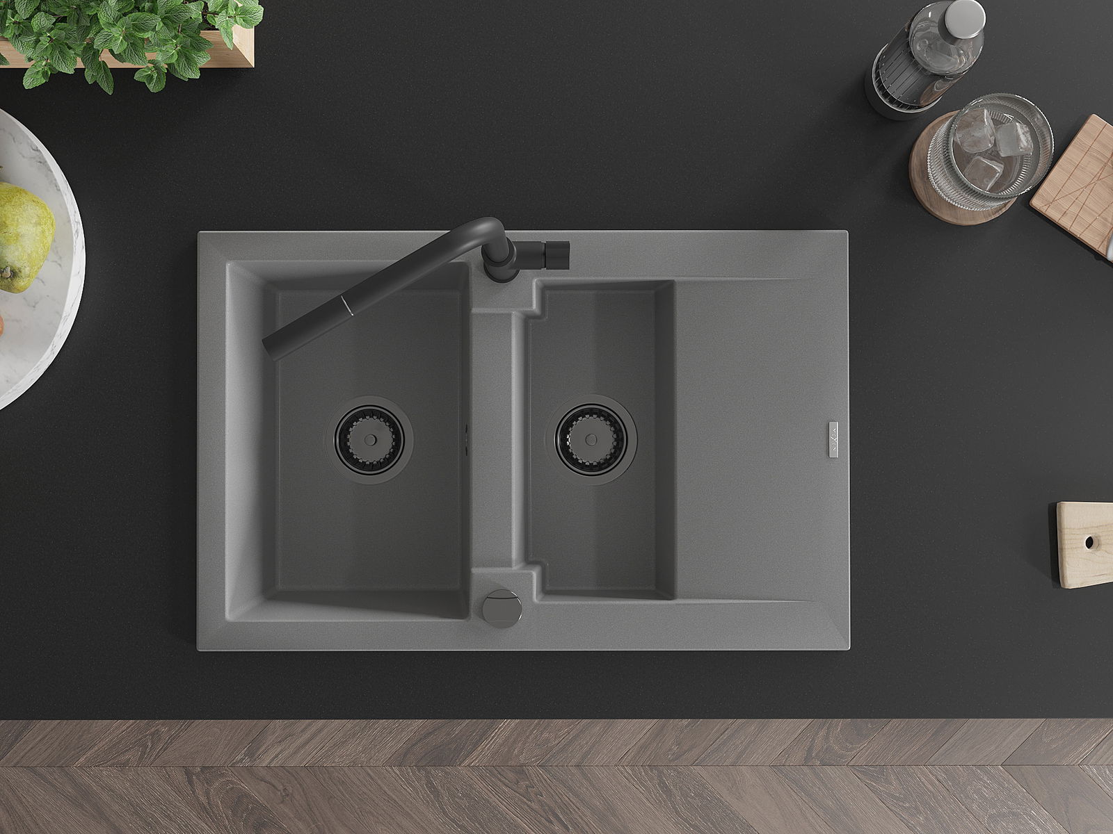 Mexen Gaspar chiuvetă de granit 1,5 compartimente cu scurgător și baterie de bucătărie Flora, gri - 6507-71-670401-70-B