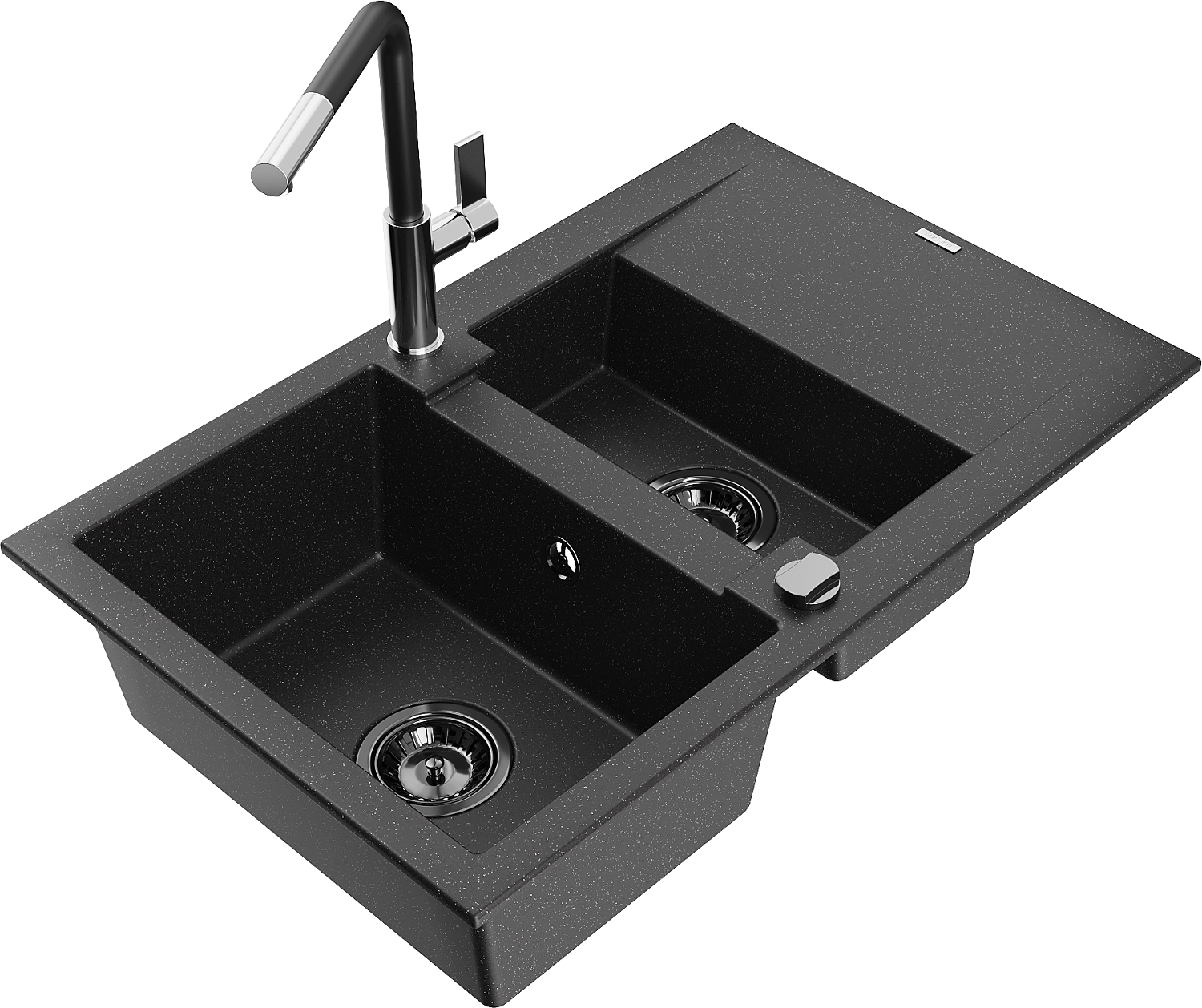 Mexen Gaspar chiuvetă de bucătărie din granit cu 1,5 cuve cu scurgător și baterie Flora, negru/argintiu - 6507-73-670401-07-B