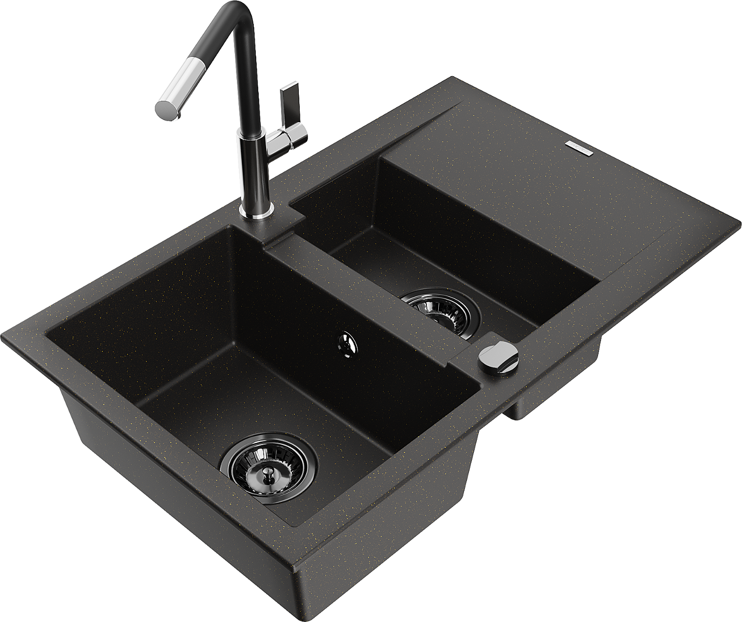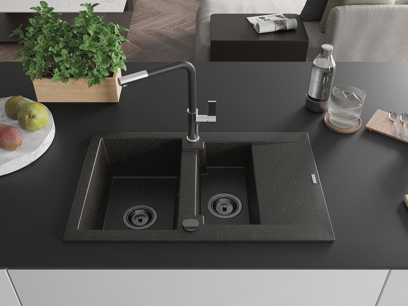 Mexen Gaspar chiuvetă din granit cu 1,5 compartimente cu scurgător și baterie de bucătărie Flora, negru/auriu
