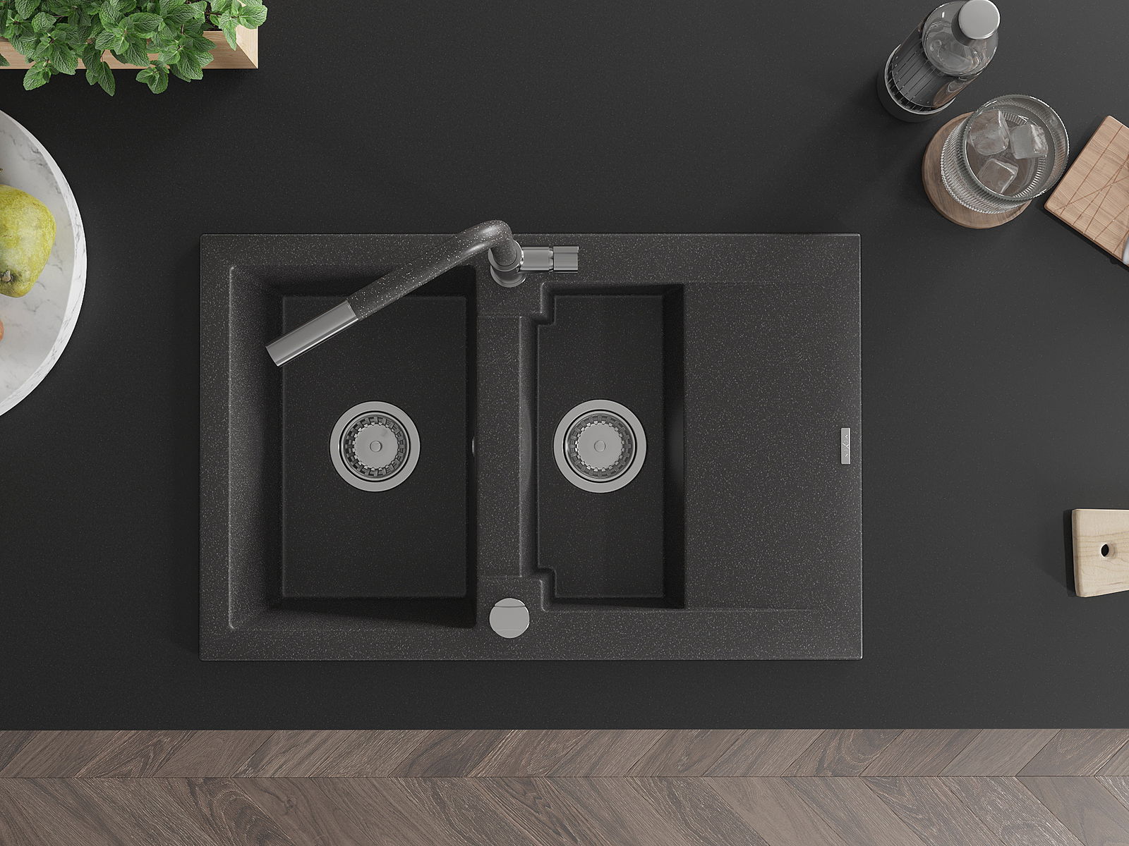 Mexen Gaspar chiuvetă granit 1,5 compartiment cu uscător și baterie de bucătărie Flora, negru pătat - 6507-76-670401-08