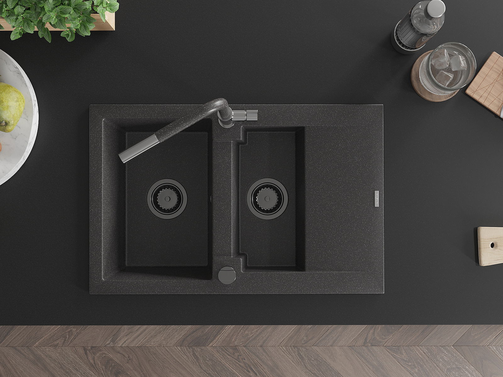 Mexen Gaspar chiuvetă din granit cu 1,5 cuve și scurgător și baterie de bucătărie Flora, negru cu stropi